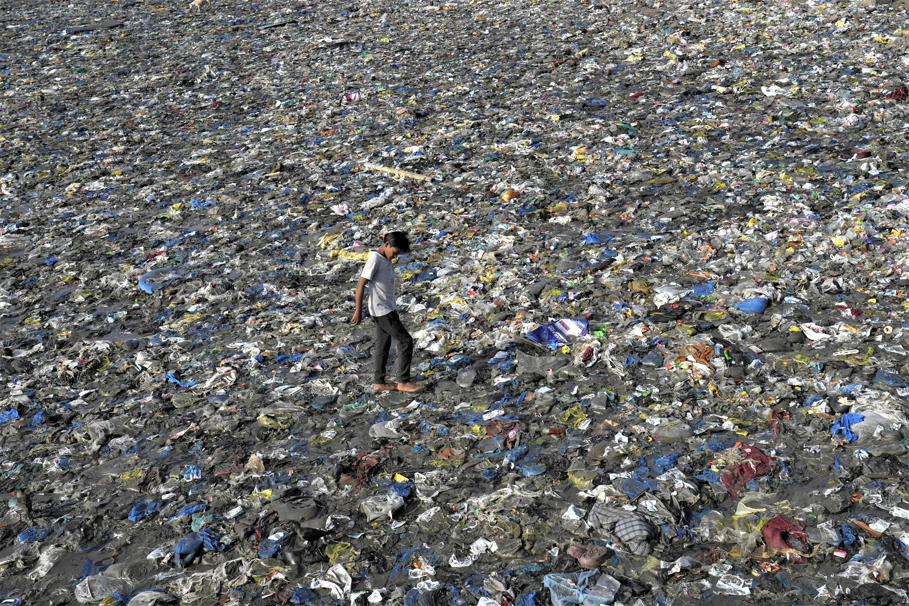 A boy walks on the plastic waste at the Badhwar Park beach on the Arabian Sea coast on World Environment Day in Mumbai, India, Monday, June 5, 2023. (Photo by Rajanish Kakade/AP Photo)