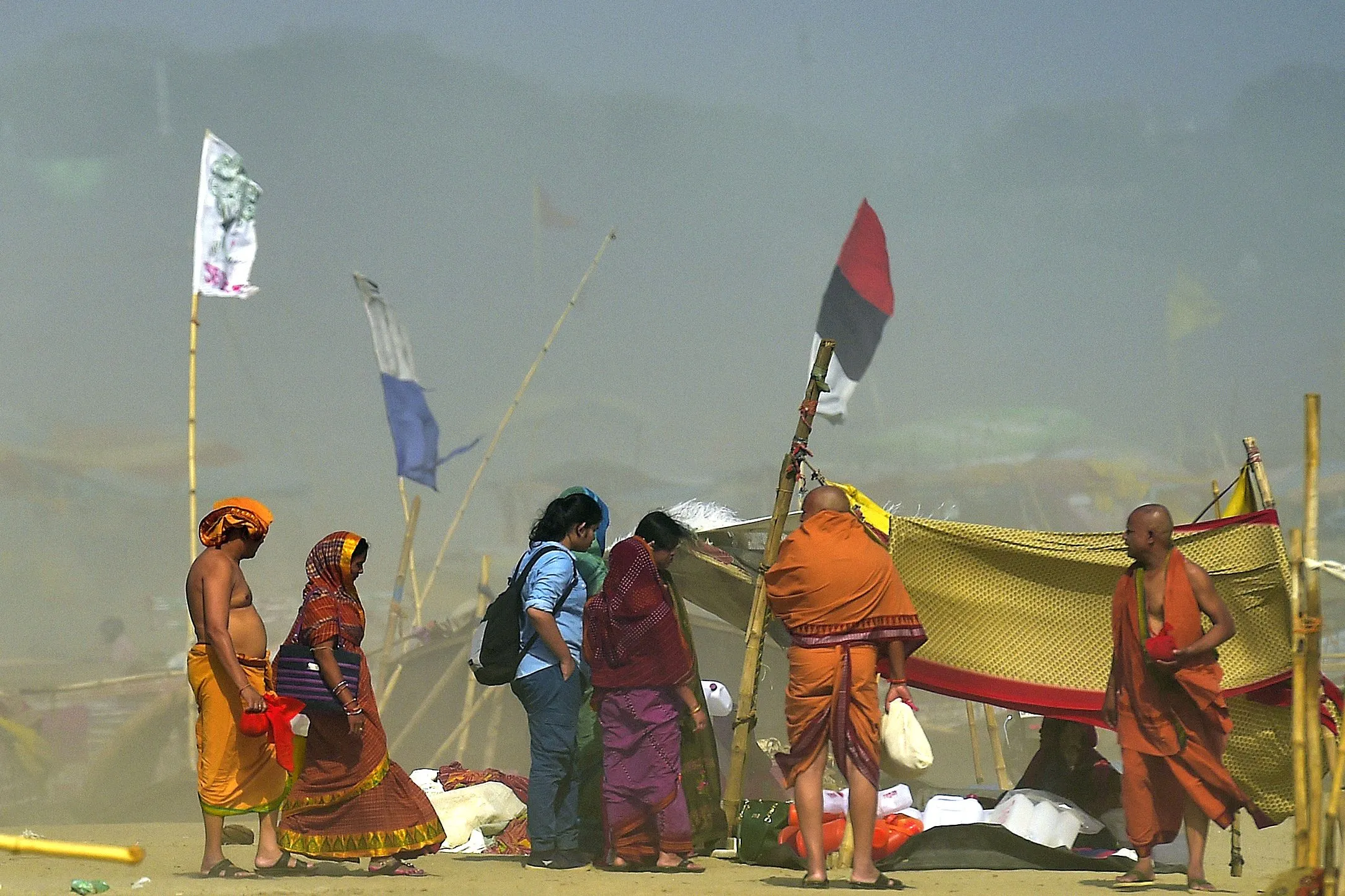Hindu devotees walk during a sandstorm at the Sangam, the confluence of the rivers Ganges, Yamuna and mythical Saraswati, in Prayagraj on June 9, 2023. (Photo by Sanjay Kanojia/AFP Photo)