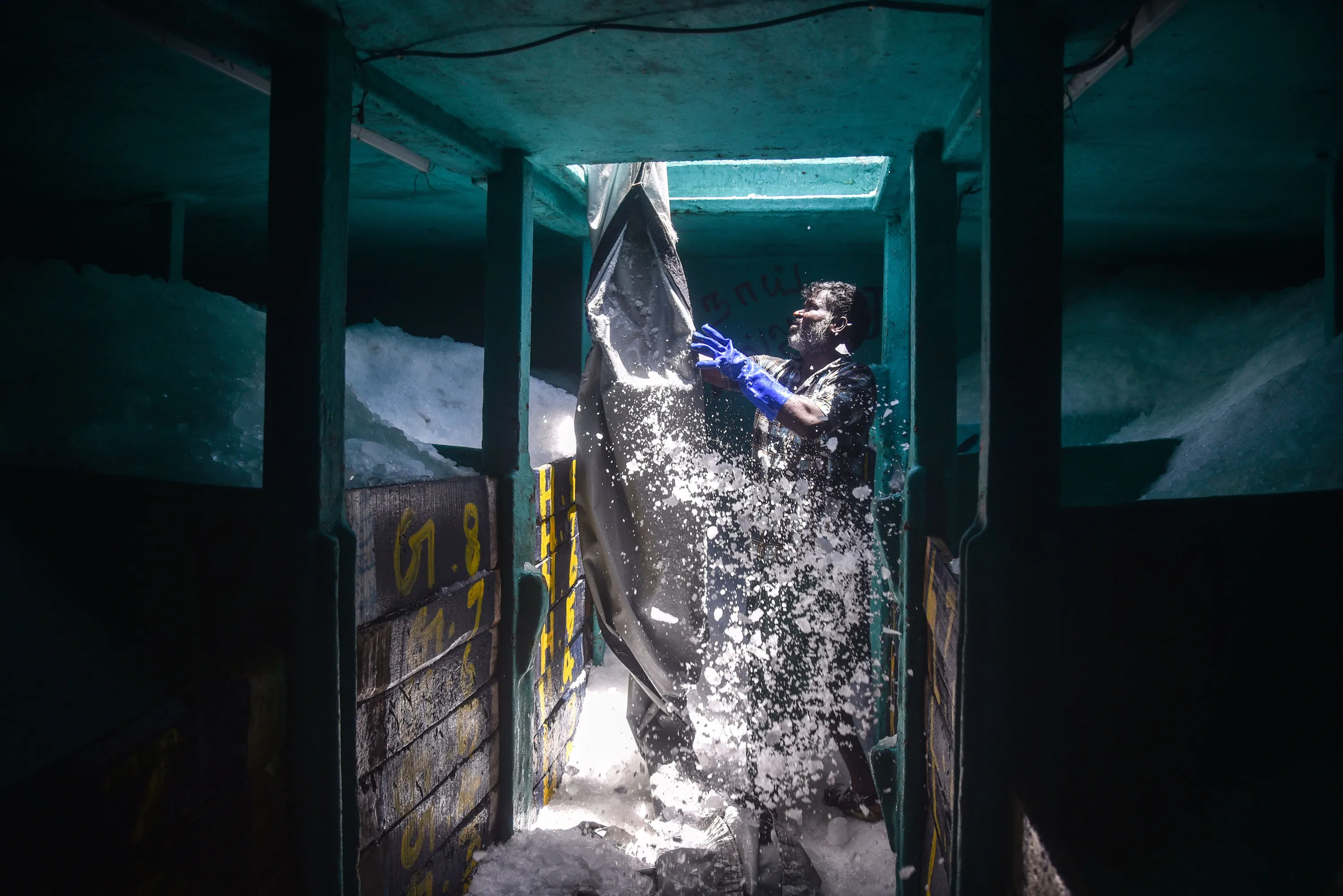 An Indian fisherman stores blocks of ice into a boat ahead of the end of the 61-day fishing ban period, at Kasimedu fishing harbor, in Chennai, India, 12 June 2023. The Indian fisheries department has imposed a 61-day seasonal fishing ban from April 15 to June 14, on trawling on the East coast of India in a bid to conserve the fisheries resources during their breeding period. (Photo by Idrees Mohammed/EPA)