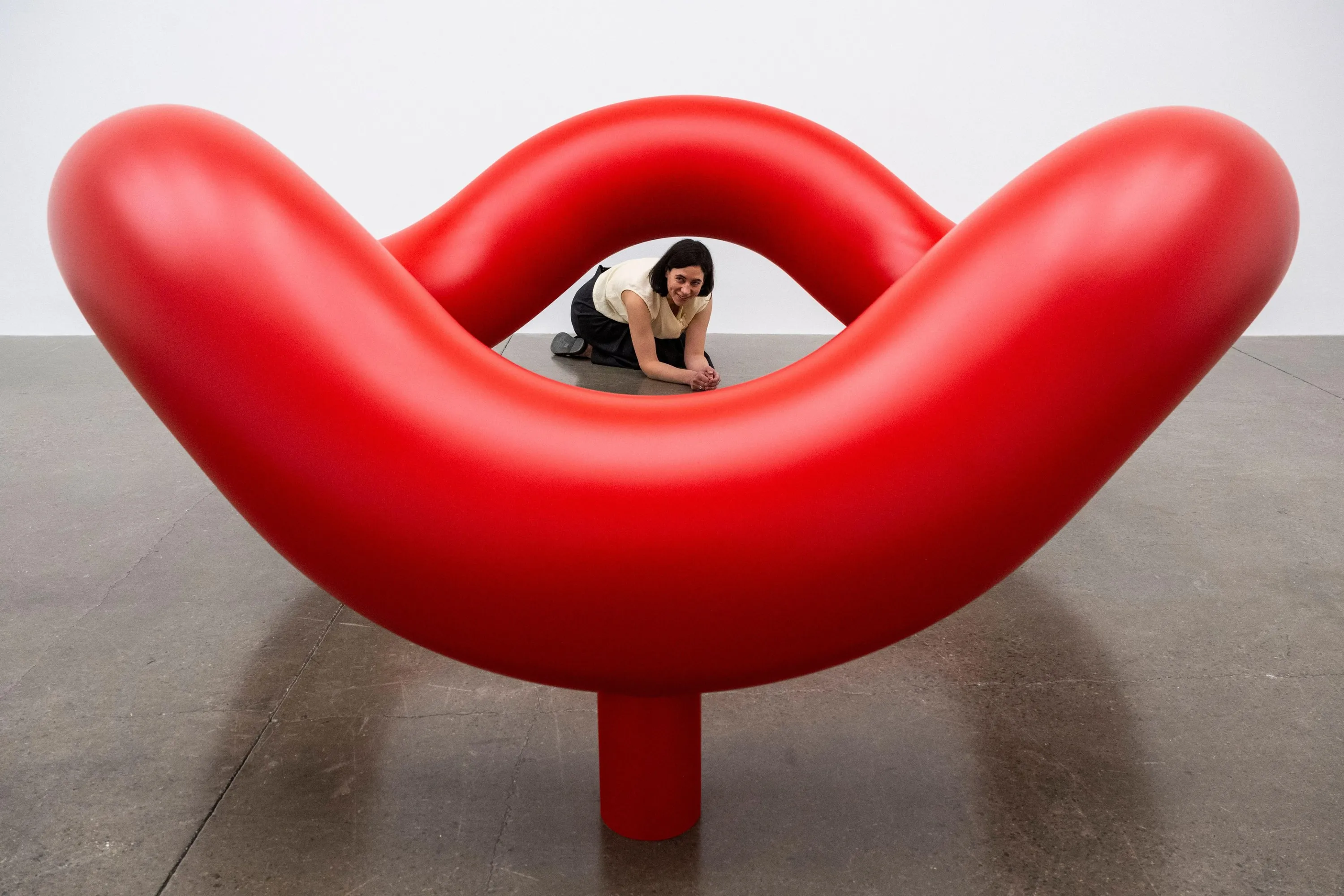 A staff member with “Play Sculpture”, c 1965-80, by Isamu Noguchi at a preview of “This Earth, This Passage”, an exhibition of artworks by Isamu Noguchi at White Cube Mason's Yard in St James's, United Kingdom on May 25, 2023. The works reflect the artist's engagement with material, performance and notions of place and are on show 26 May to 1 July. (Photo by Stephen Chung/EMPICS/Alamy Live News)