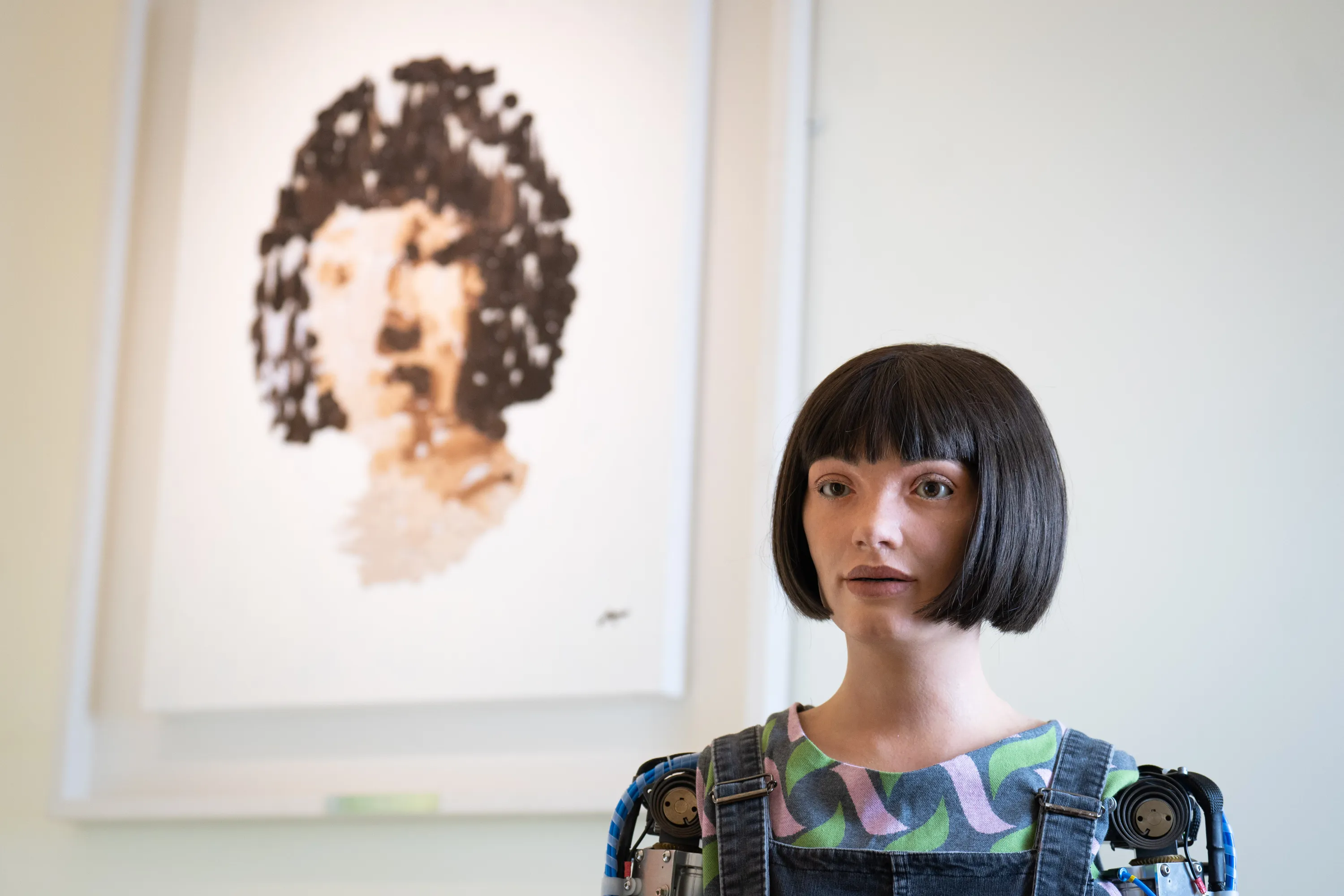 “AI Mind Home”, Ai-da the robot near her self portrait during a photo call for the London Design Biennale at Somerset House in London on Thursday, June 1, 2023. London Design Biennale promotes international collaboration and the global role of design with exhibitions and installations that demonstrate the ambition to create universal solutions to problems which concern us all. (Photo by James Manning/PA Images via Getty Images)