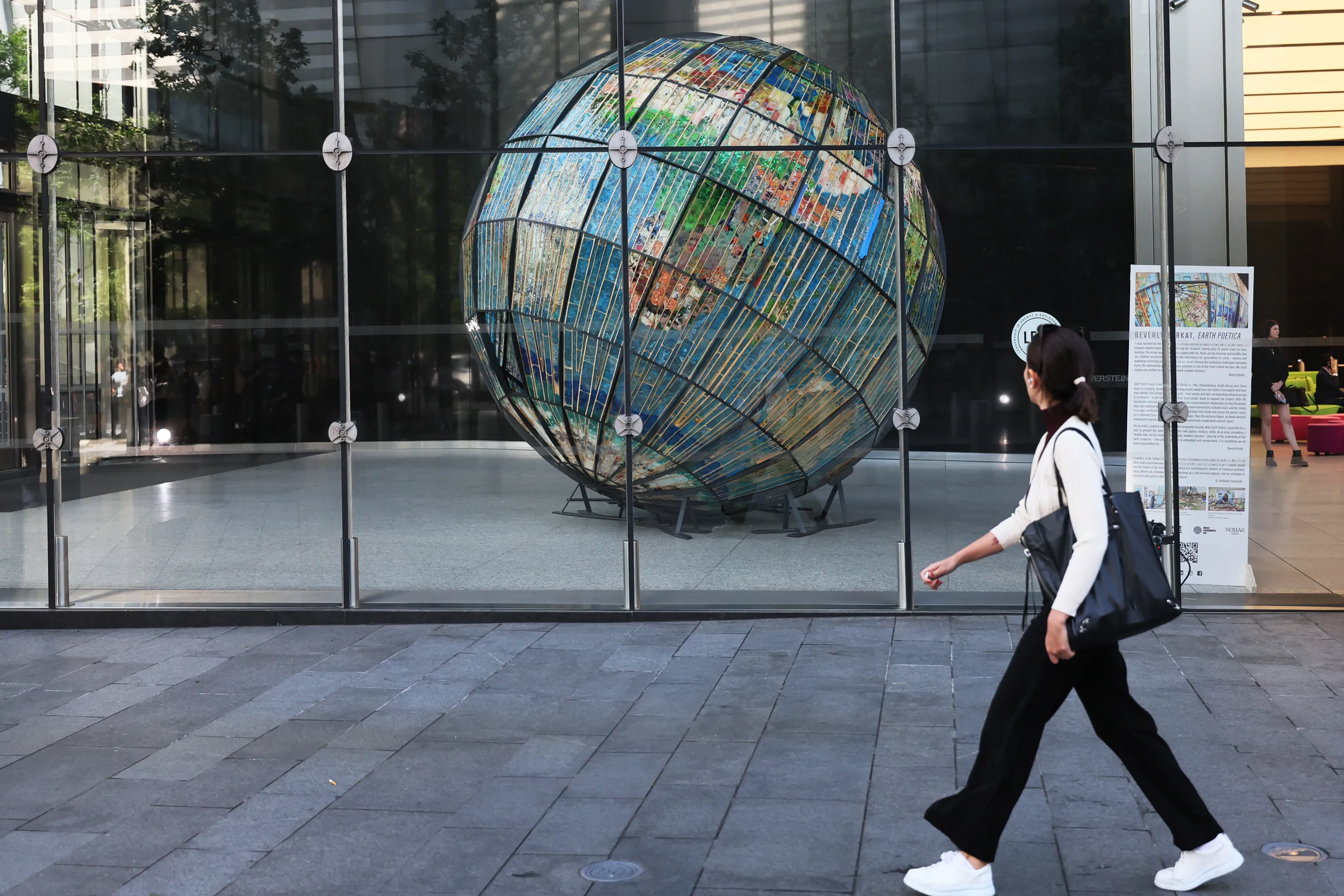 A person looks at the sculpture “Earth Poetica” by Israeli Artist Beverly Barkat as they walk past the 3 World Trade Center building on June 05, 2023 in New York City. Barket debuted her sculpture “Earth Poetica” on the 50th anniversary of the U.N.'s World Environment Day in the lobby of a building in the World Trade Center complex overlooking Ground Zero. The sculpture, which is four meters in diameter, is made up of metal-framed panels and an inner skeleton of bamboo segments depicting the planet and its continents filled with plastic pollution accumulated from around the world. (Photo by Michael M. Santiago/Getty Images)