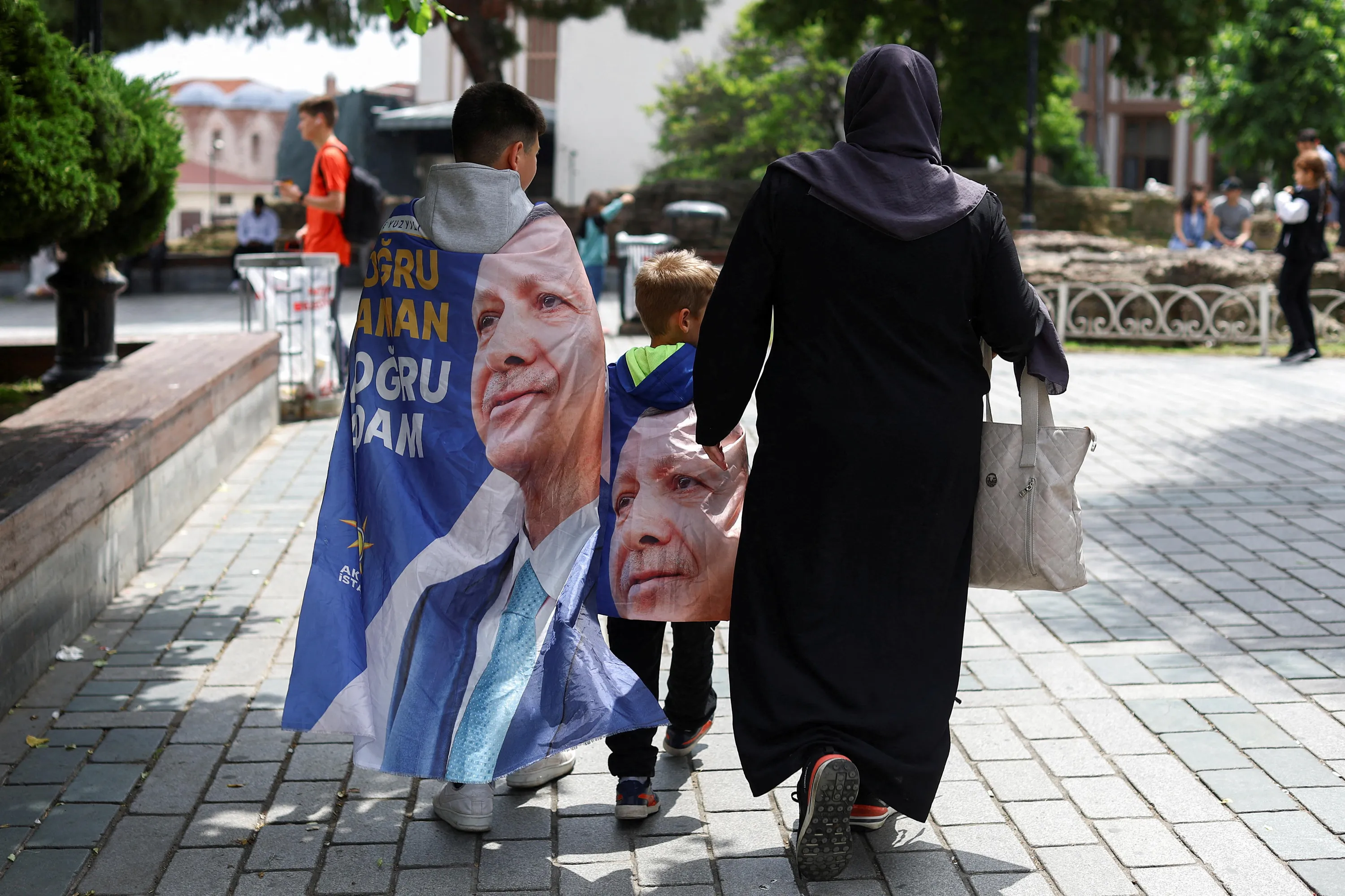 People walk while draped in banners featuring Turkish President Tayyip Erdogan, after he was declared the winner in the second round of the presidential election, in Istanbul, Turkey on May 29, 2023. (Photo by Hannah McKay/Reuters)