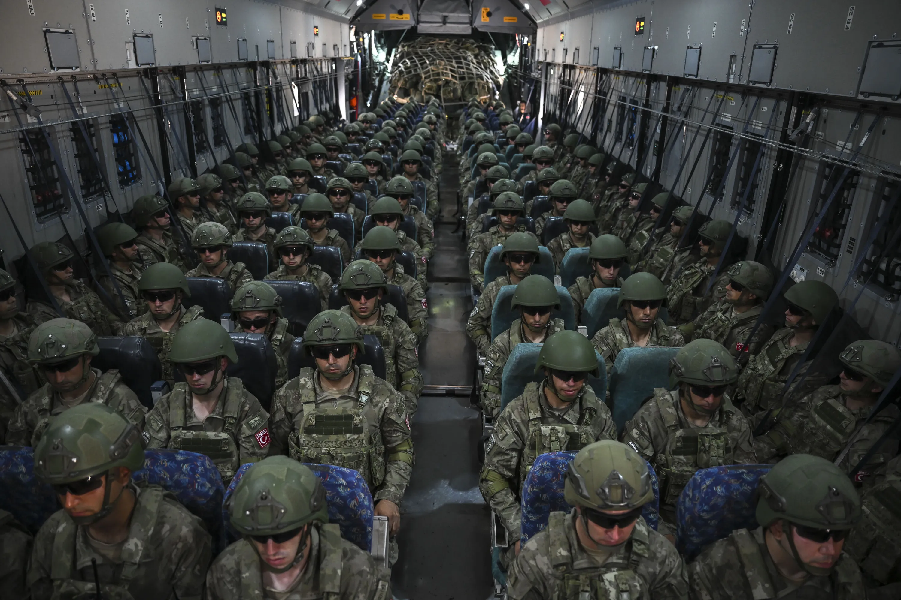 An interior view of the military aircraft to be used for the transition of 65th Mechanised Infantry Brigade Command from Corlu military airport to Kosovo upon the request of the NATO Joint Force Command in Tekirdag, Turkiye on June 7, 2023. Turkish commando battalion is commisioned as the reserve force due to the events happened in Kosovo. (Photo by Arif Hudaverdi Yaman/Anadolu Agency via Getty Images)