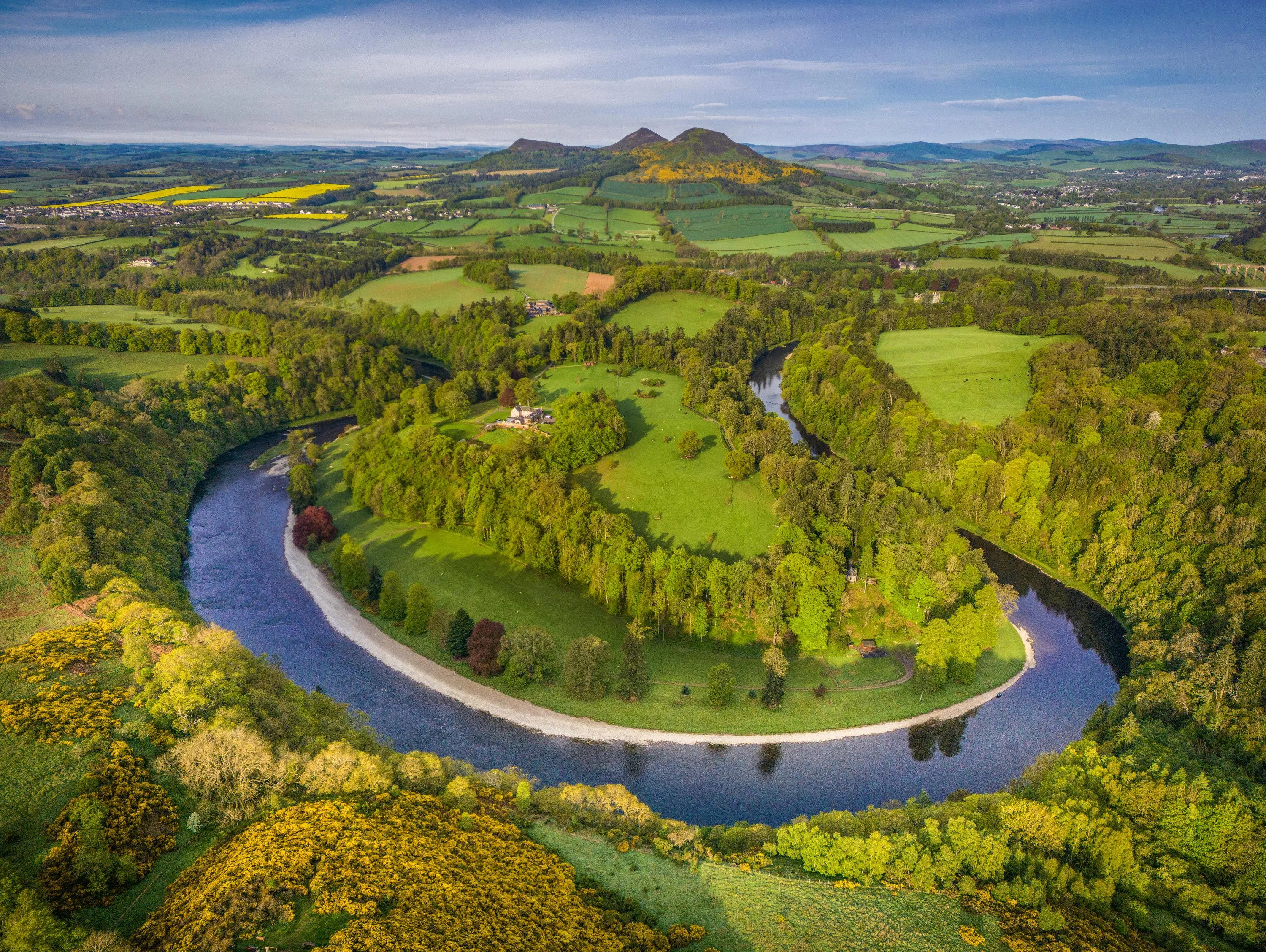 An early morning view of the famous salmon fishing beat on the River Tweed curve at Bemersyde from above Scott’s View looking towards the Eildon Hills on the Scottish Borders in the second decade of May 2023. Bemersyde was bought by the British Government in 1921 and presented to Field-Marshal The 1st Earl Haig. The lookout was known to be one of Sir Walter Scott's favourite places to come and reflect. (Photo by Phil Wilkinson/The Times)