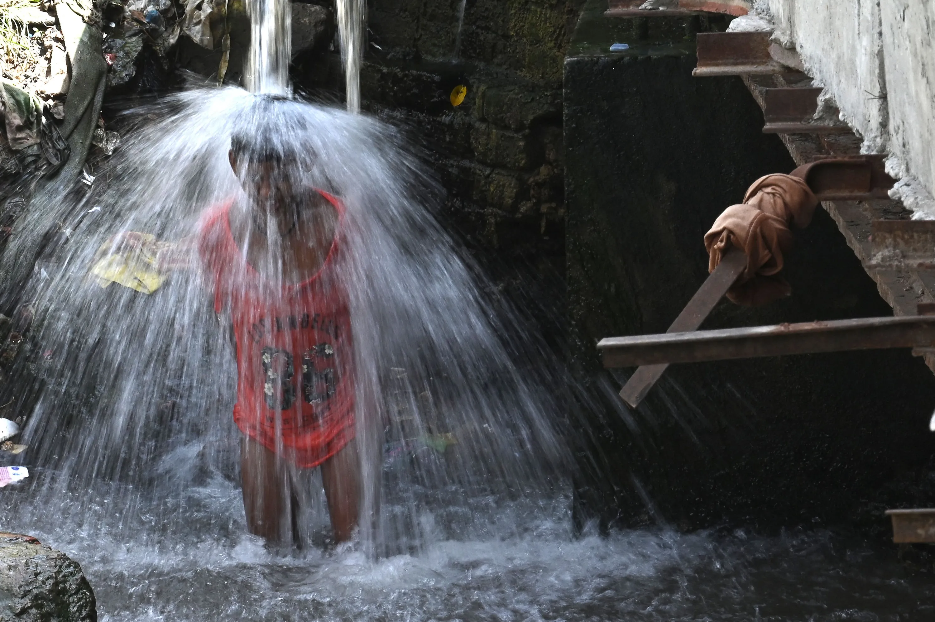 A boy cools off under an overflowing water pipe in New Delhi on June 13, 2023. (Photo by Arun Sankar/AFP Photo)