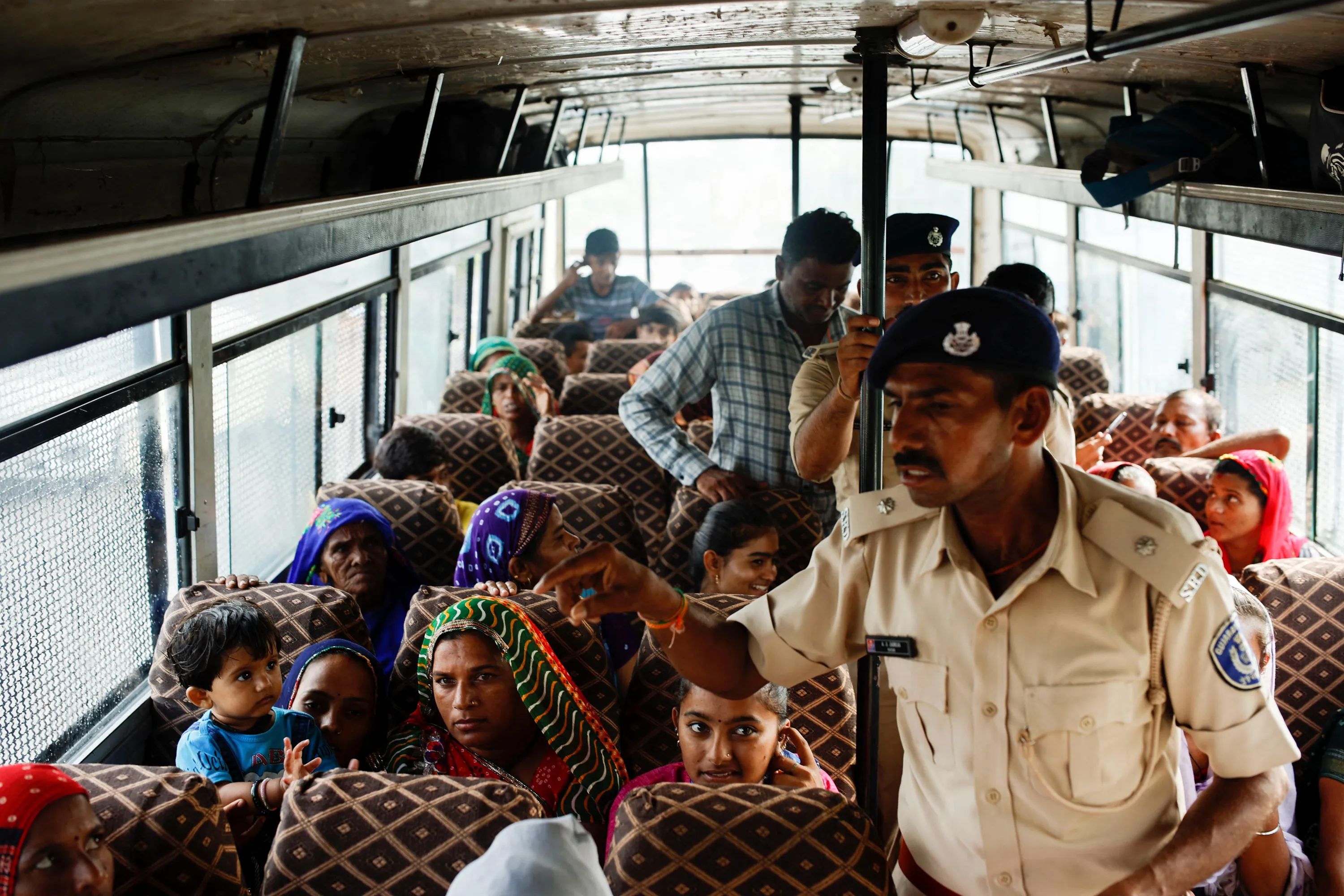 People sit in a bus during an evacuation as a police officer does a headcount before the arrival of cyclone Biparjoy in Jakhau, in the western state of Gujarat, in Jakhau, India on June 14, 2023. (Photo by Francis Mascarenhas/Reuters)