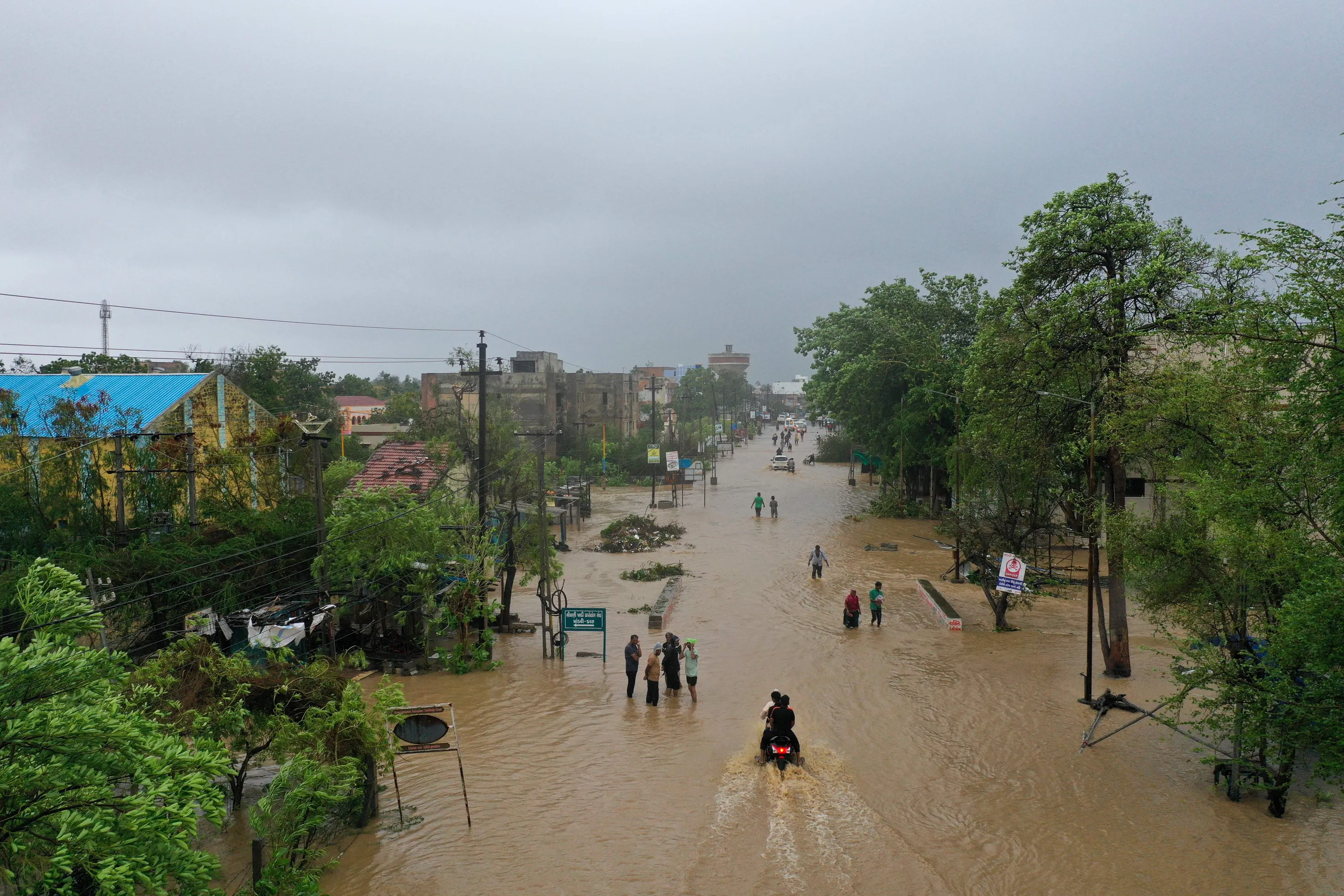 An aerial picture shows residents wading along a waterlogged road in Mandvi on June 16, 2023, after Cyclone Biparjoy made landfall. Cyclone Biparjoy tore down power poles and uprooted trees Friday after pummelling the Indian coastline, though the storm was weaker than feared and there were no immediate reports of deaths. (Photo by Shubham Koul/AFP Photo)