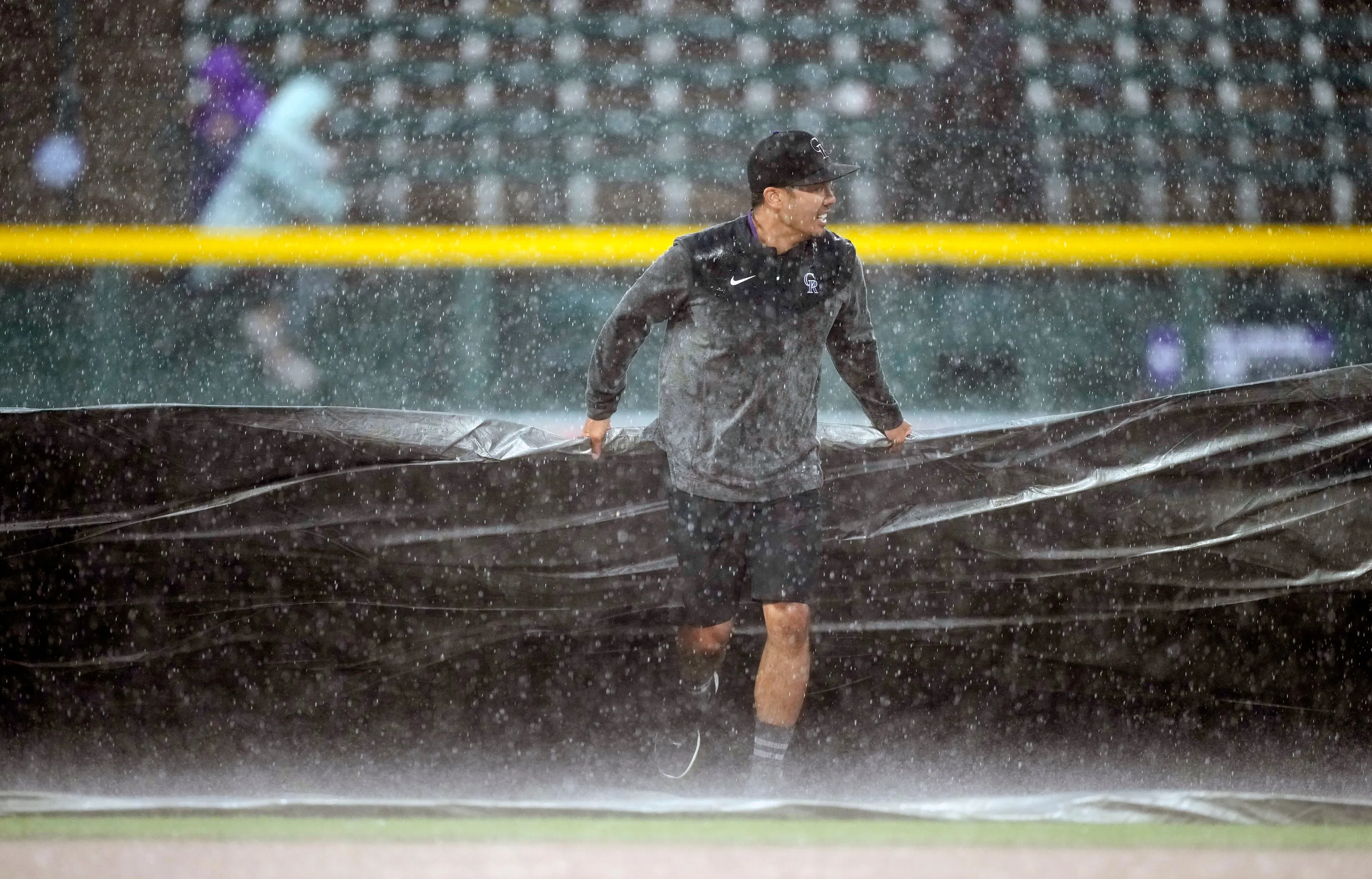 A member of the grounds crew pulls the tarpaulin as a heavy rain swamps Coors Field in the bottom of the ninth inning of a baseball game between the San Diego Padres and the Colorado Rockies, Sunday, June 11, 2023, in Denver. (Photo by David Zalubowski/AP Photo)