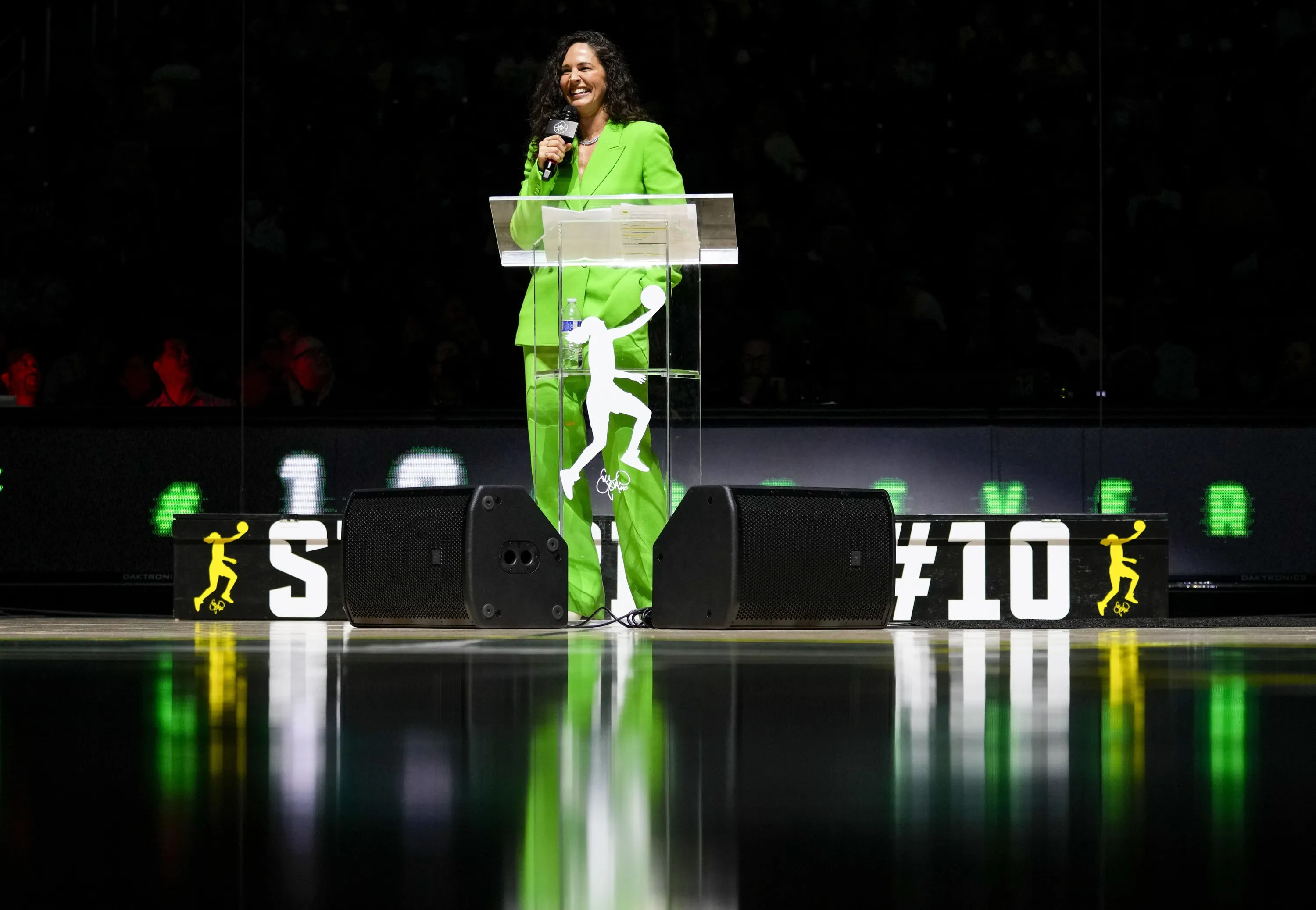 Former Seattle Storm player Sue Bird speaks during her jersey retirement ceremony following a WNBA basketball game between the Seattle Storm and the Washington Mystics, Sunday, June 11, 2023, in Seattle. (Photo by Lindsey Wasson/AP Photo)