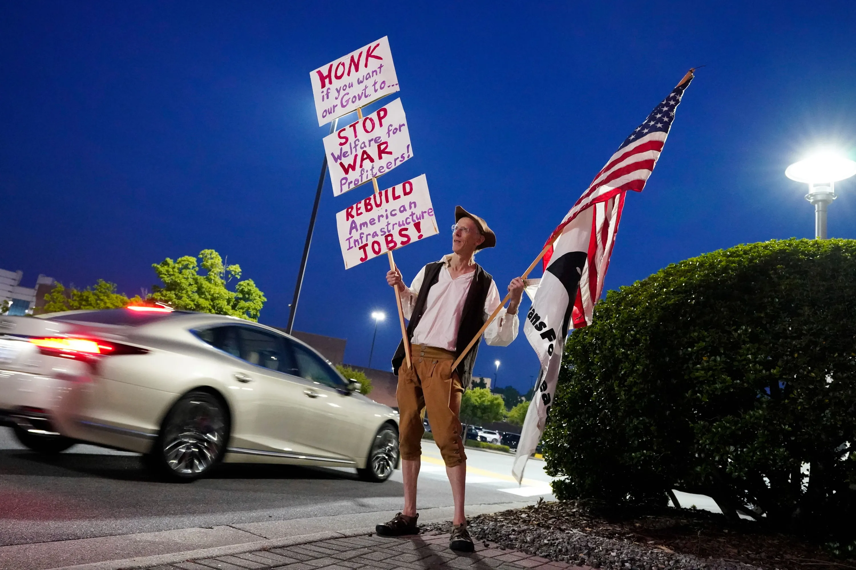 Roger Ehrlich, of Veterans for Peace, holds signs as cars pass by after former President Donald Trump spoke at the North Carolina Republican Party Convention in Greensboro, N.C., Saturday, June 10, 2023. (Photo by George Walker IV/AP Photo)