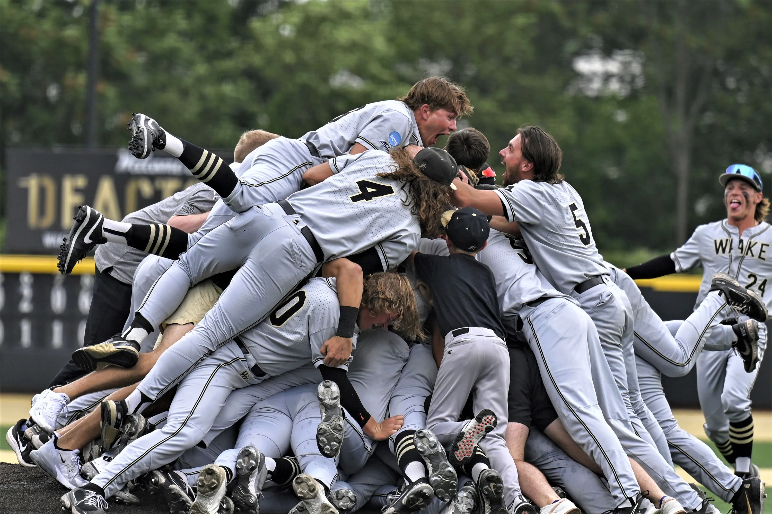 Wake Forest celebrates after winning an NCAA college baseball tournament super regional game against Alabama, Sunday, June 11, 2023, in Winston-Salem, N.C. (Photo by Matt Kelley/AP Photo)