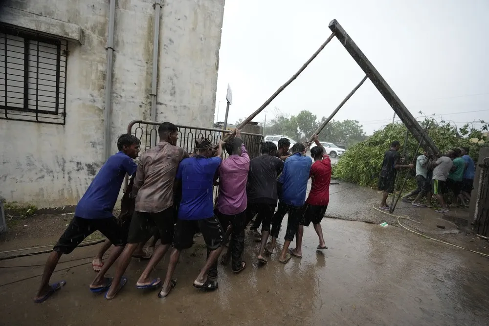 Workers fix a pole to restore electricity following heavy winds and incessant rains after landfall of cyclone Biparjoy at Mandvi in Kutch district of Western Indian state of Gujarat, Friday, June 16, 2023. (Photo by Ajit Solanki/AP Photo)