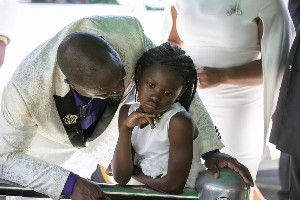 Eddie Owens talks with his daughter Africa at the grave after the funeral for Africa's mother Ajike Owens on Monday, June 12, 2023, at Highland Memorial Parkin Ocala, Fla. Owens was fatally shot by her neighbor Susan Lorincz when she went to Lorincz's door. Lorincz was arrested and charged in the shooting. (Photo by Alan Youngblood/AP Photo)