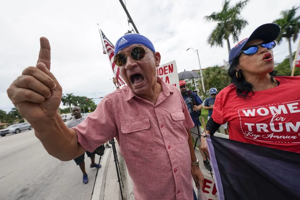 Supporters of former President Donald Trump, Oswaldo Hernandez, left, and Maribel Gonzalez of Miami, await Trump's arrival at Trump National Doral resort in Doral, Fla., Monday, June 12, 2023. (Photo by Gerald Herbert/AP Photo)