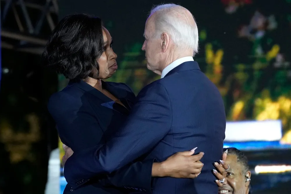 President Joe Biden talks with Jennifer Hudson following her performance during a Juneteenth concert on the South Lawn of the White House in Washington, Tuesday, June 13, 2023. (Photo by Susan Walsh/AP Photo)