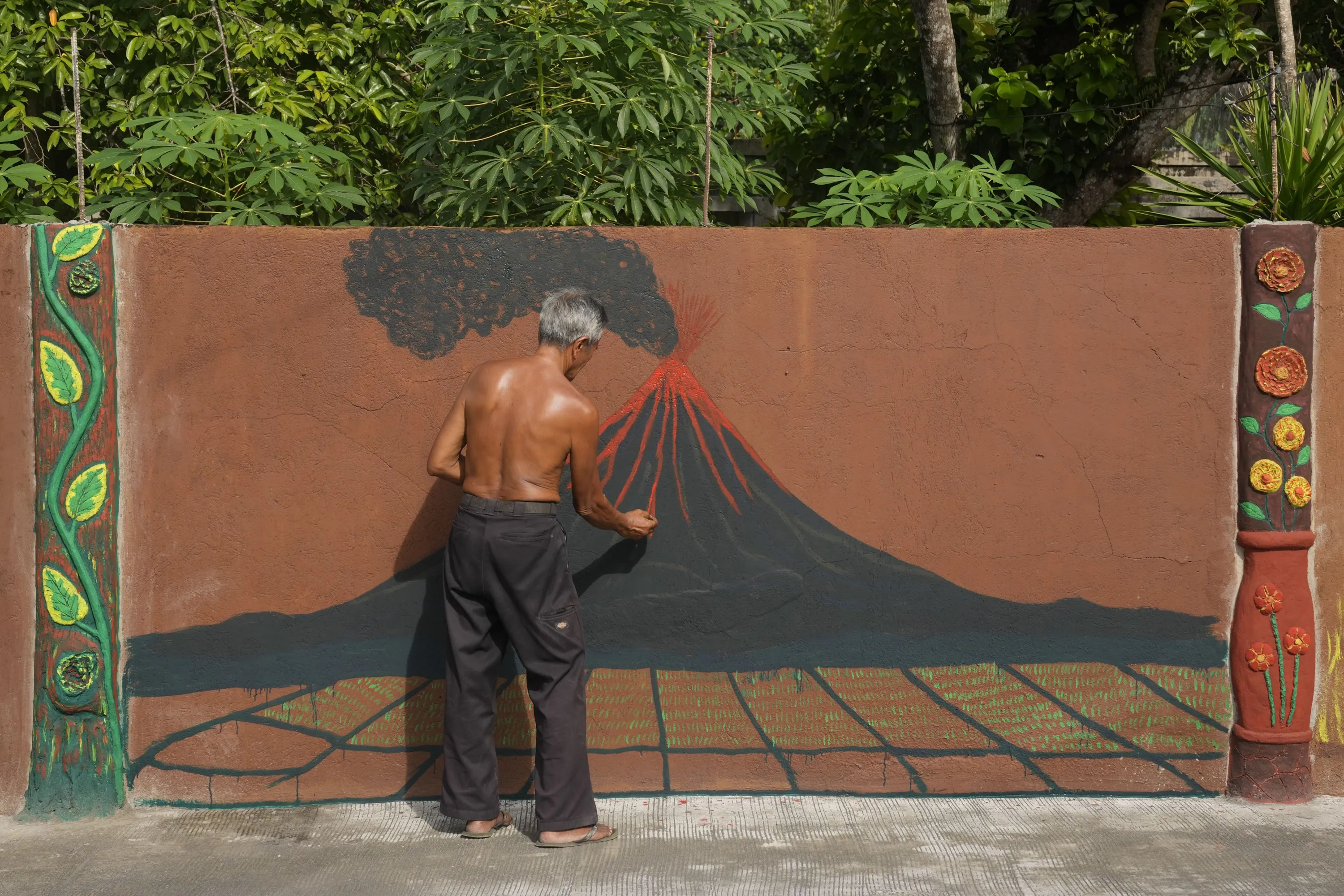 Violeta Peralta paints a picture of an erupting Mayon Volcano outside his home in Legaspi, Albay province, northeastern Philippines, Sunday, June 11, 2023. Thousands of villagers have been forced to leave rural communities within a 6-kilometer radius of Mayon volcano's crater in Albay province which was placed under a state of calamity on Friday to allow more rapid disbursement of emergency funds in case a major eruption unfolds. (Photo by Aaron Favila/AP Photo)