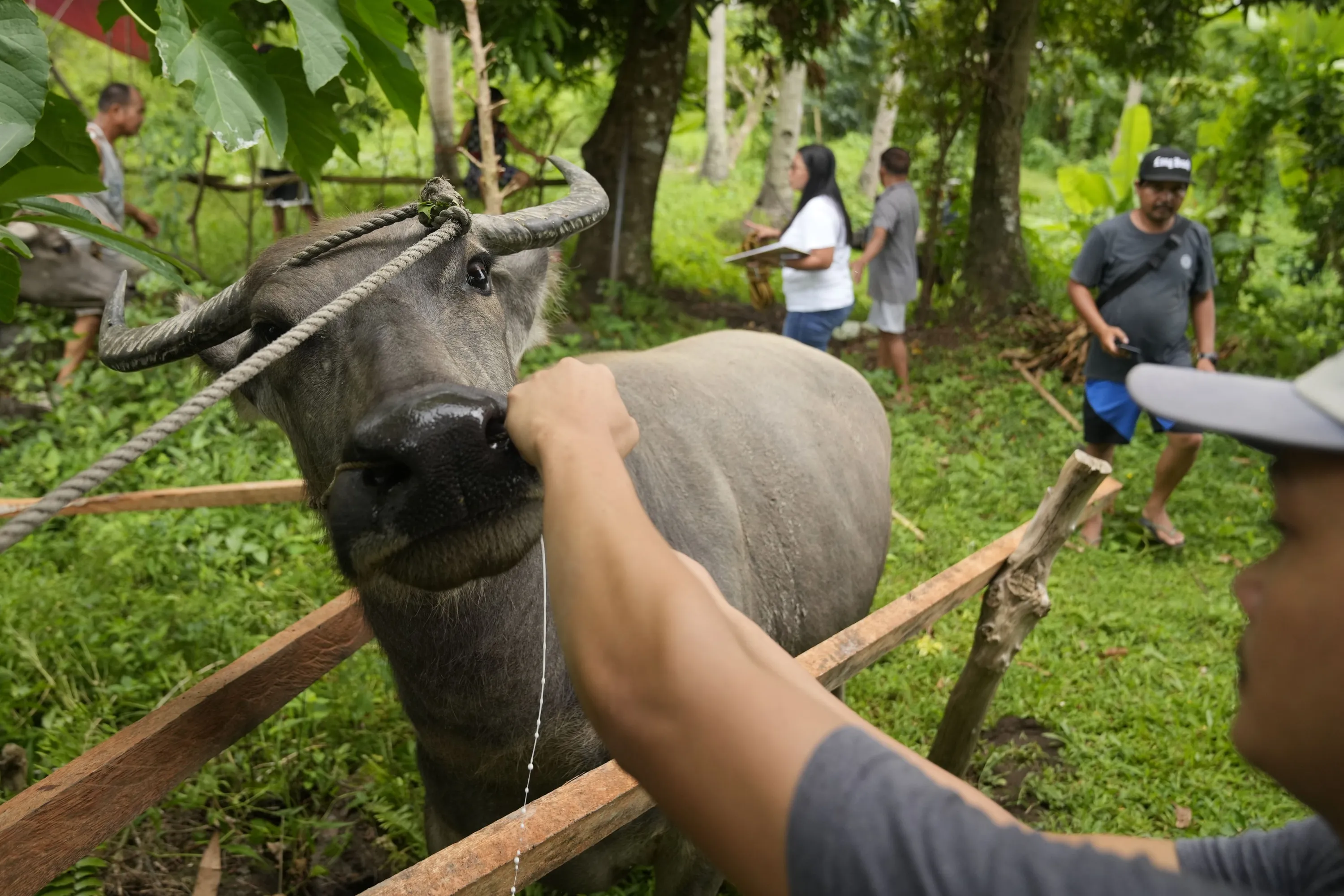 A water buffalo receives oral deworming fluids from a veterinarian as they are brought to a pooling center outside the 6-kilometer “permanent danger zone” near Mayon Volcano in Daraga, Albay province, northeastern Philippines, Sunday, June 11, 2023. (Photo by Aaron Favila/AP Photo)
