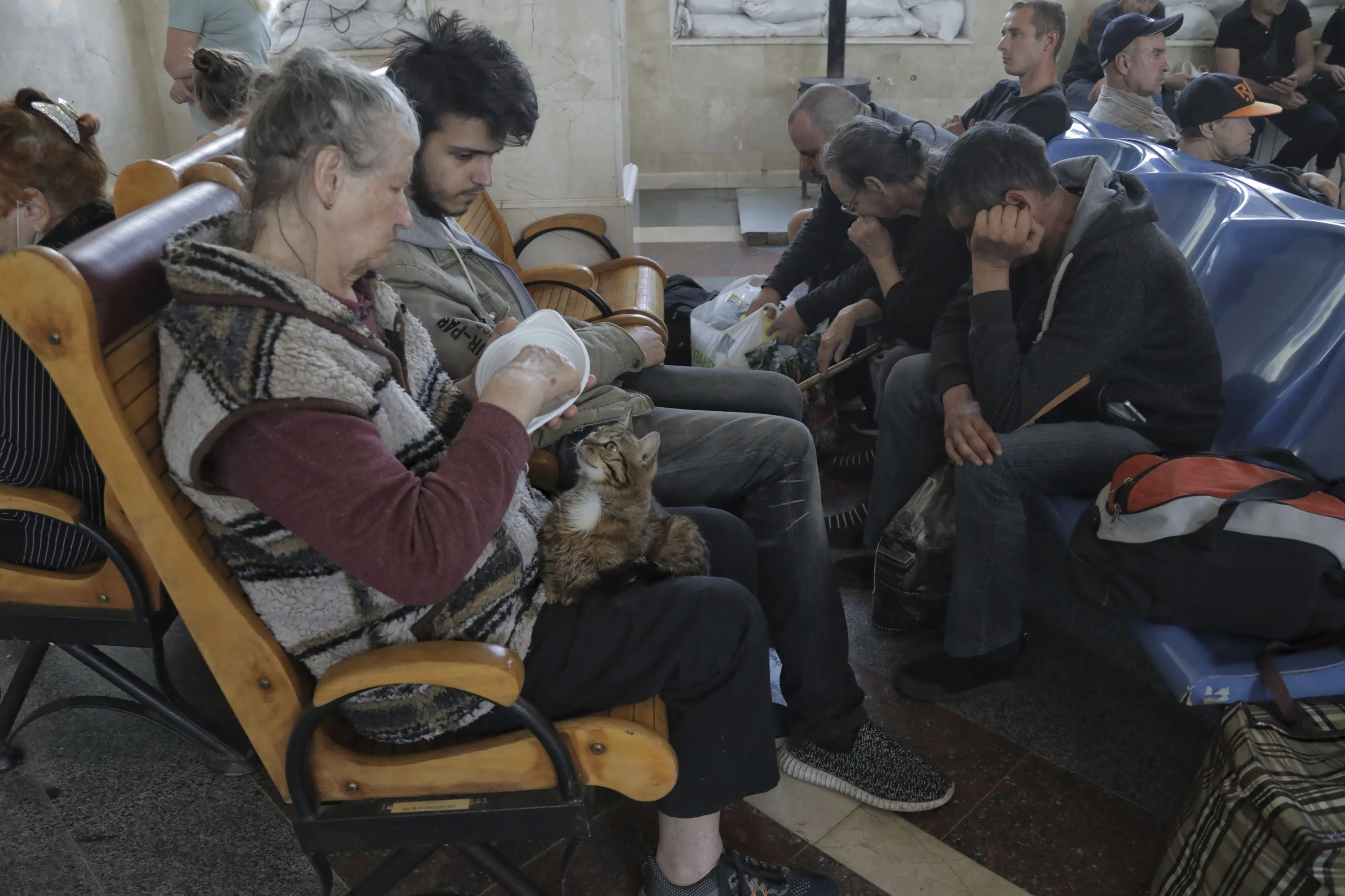 People wait for an evacuation train at a railway station in Kherson, Ukraine, Tuesday, June 6, 2023. Ukraine on Tuesday accused Russian forces of blowing up a major dam and hydroelectric power station in a part of southern Ukraine that Russia controls, risking environmental disaster. (Photo by Nina Lyashonok/AP Photo)
