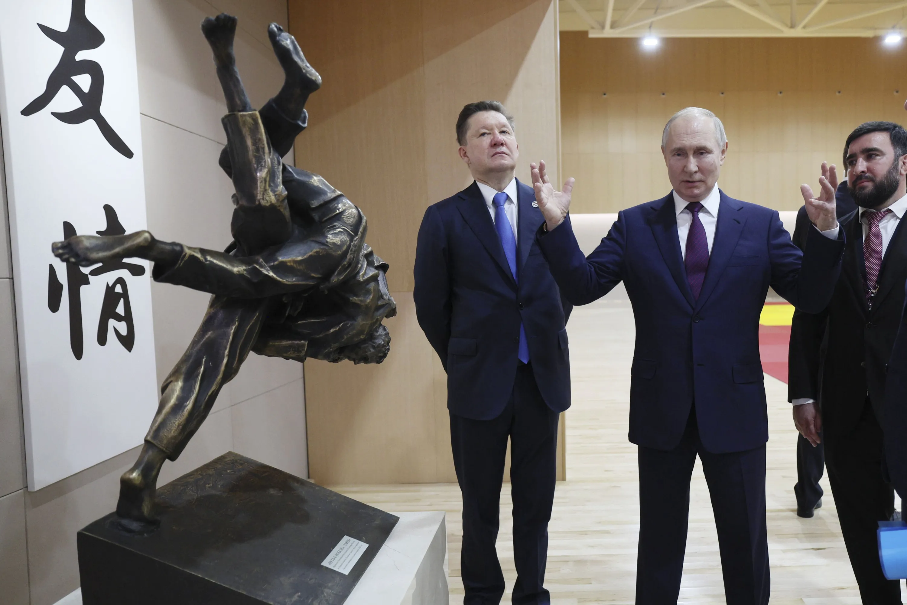 Russian President Vladimir Putin, accompanied by Gazprom CEO Alexei Miller, left, visits a martial arts academy at Sirius Park in the resort city of Sochi, Russia, Friday, June 9, 2023. (Photo by Gavriil Grigorov, Sputnik, Kremlin Pool Photo via AP Photo)