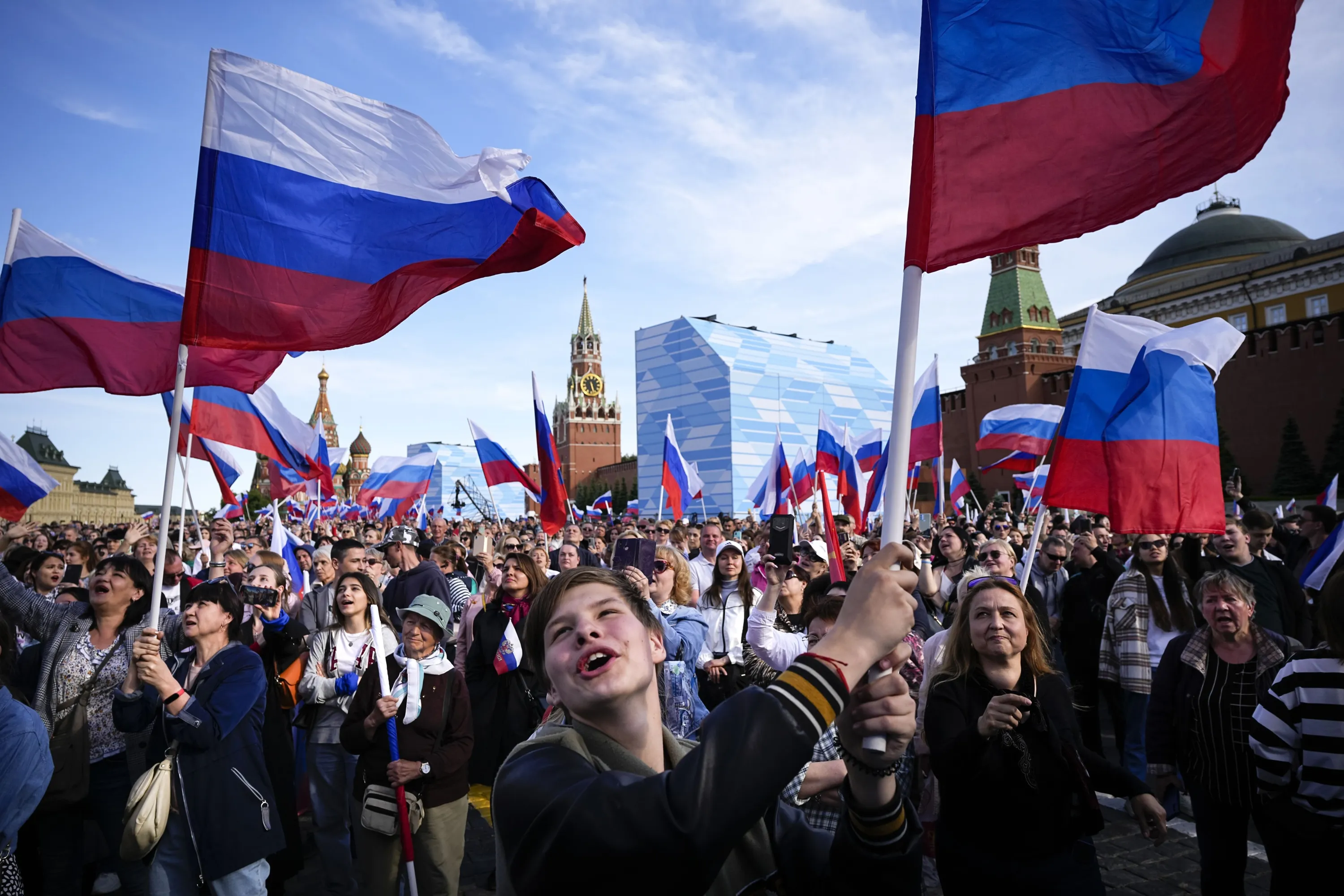 Thousands of people wave Russian national flags as they gather on Red Square to watch a concert dedicated to the Day of Russia in Moscow, Russia, Sunday, June 11, 2023. The Day of Russia is celebrated annually on 12 June. (Photo by Alexander Zemlianichenko/AP Photo)