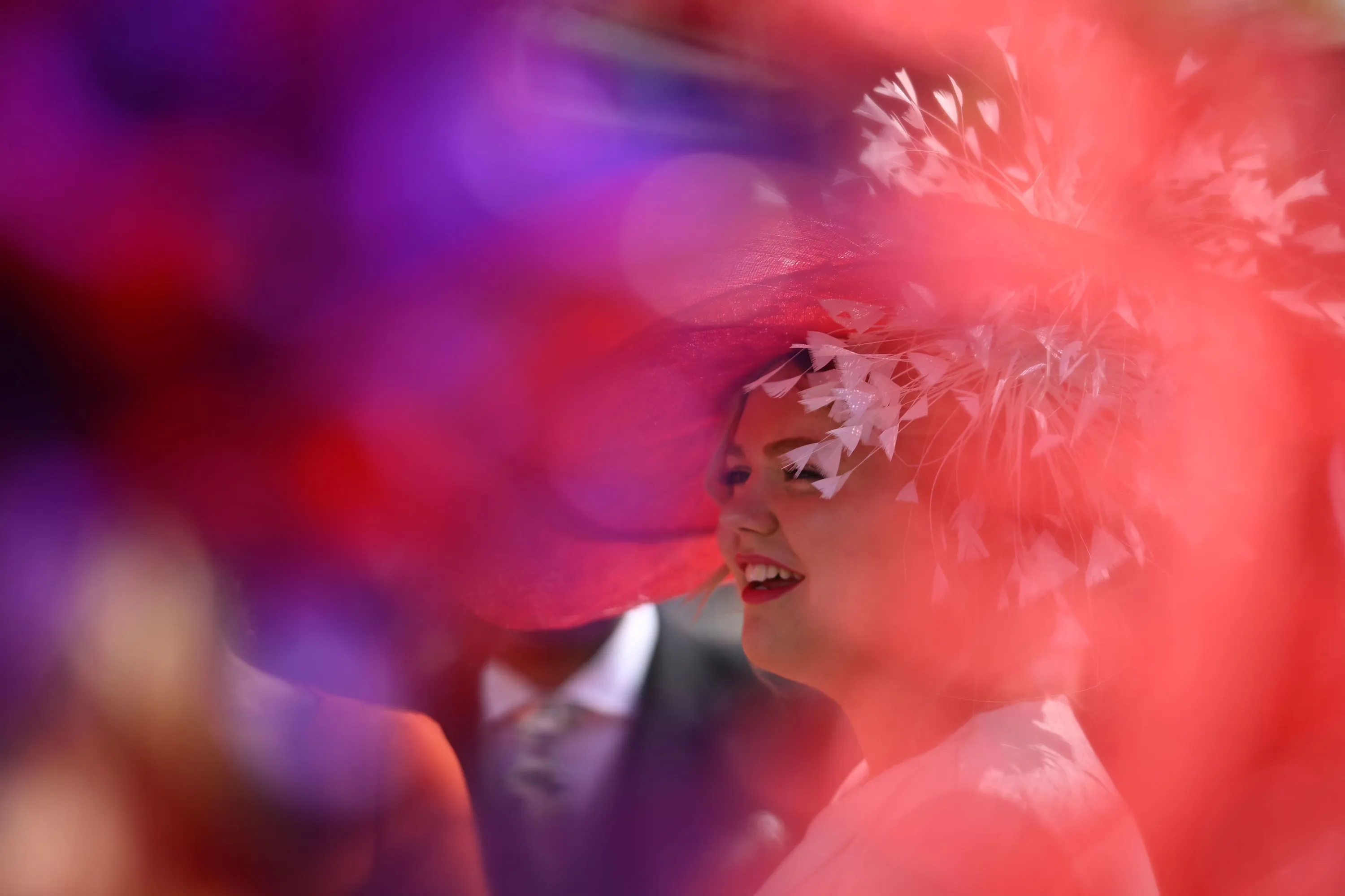 A racegoer smiles in the summer sunshine on Ladies Day, the third day of the Royal Ascot horse racing meeting in Ascot, west of London, on June 22, 2023. (Photo by Justin Tallis/AFP Photo)