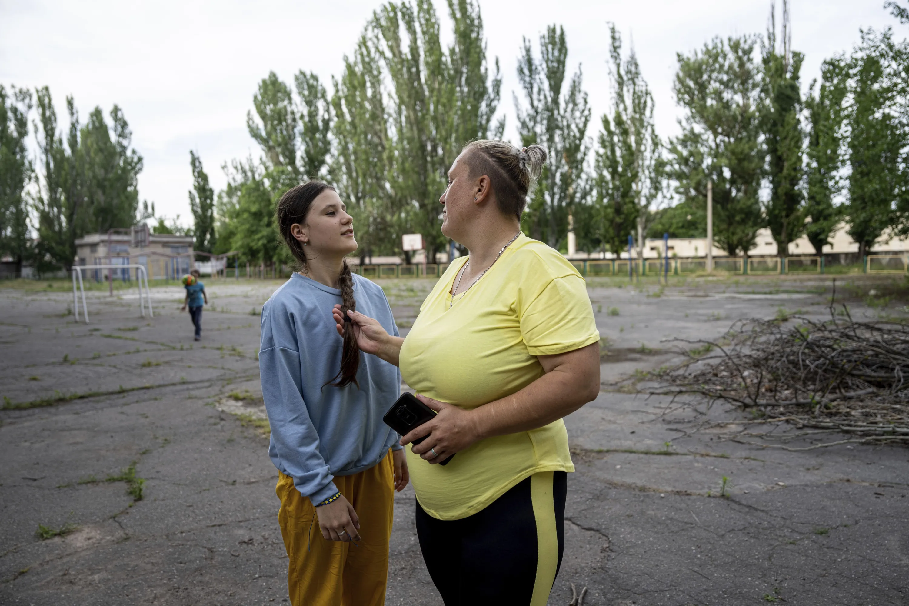 Yulia Valhe, right, speaks to her daughter Viktoria, in Kherson, Ukraine, Tuesday, June 13, 2023. Valhe, who was recently evacuated during the flooding from the Russian-occupied town of Oleshky, said “the Russian Federation provided nothing. No aid, no evacuation. They abandoned people alone to deal with the disaster”. (Photo by Evgeniy Maloletka/AP Photo)
