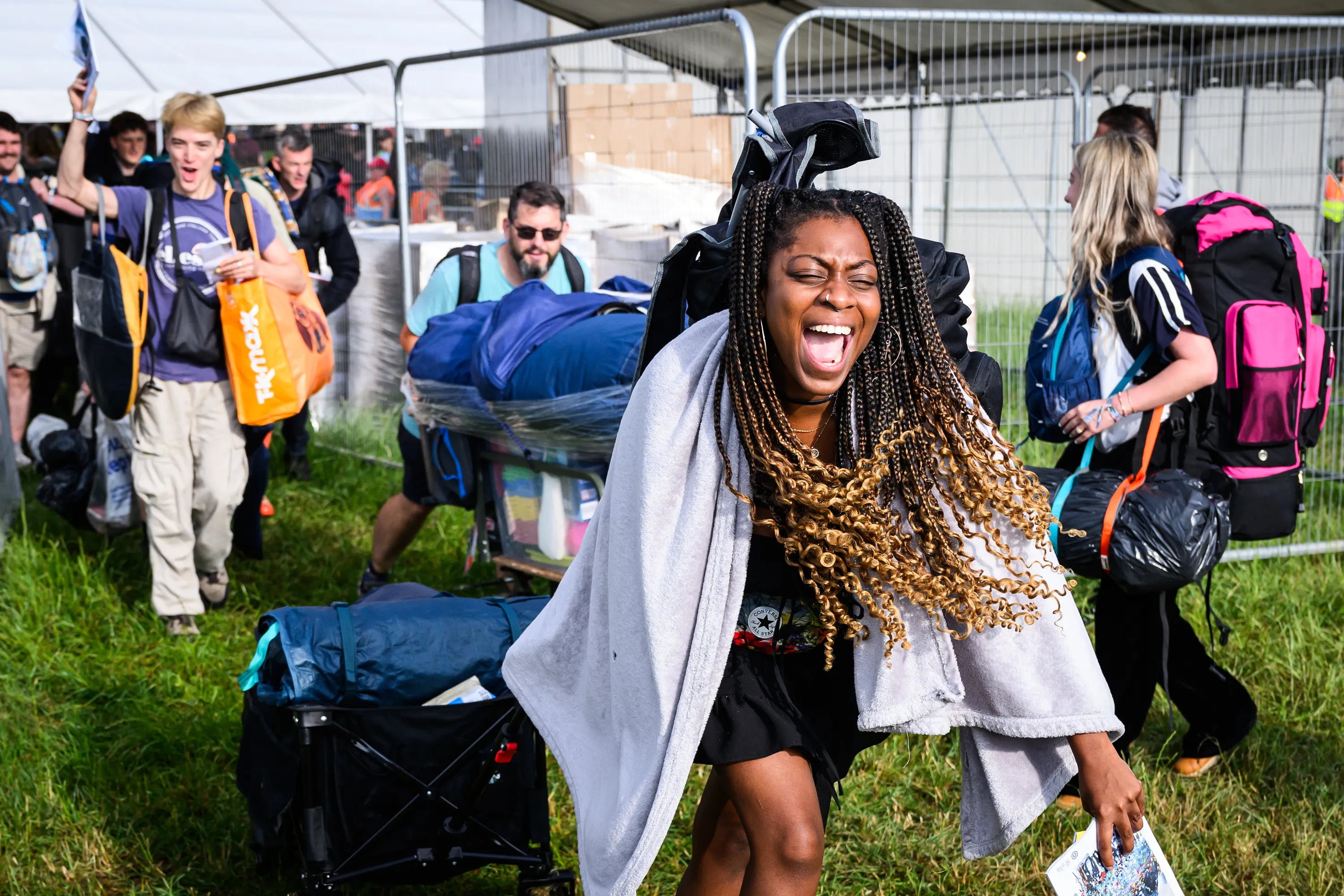 Revellers celebrate as they pass through gates after the 8am public opening of the campsites on Day 1 of Glastonbury Festival 2023 on June 21, 2023 in Glastonbury, England. (Photo by Leon Neal/Getty Images)