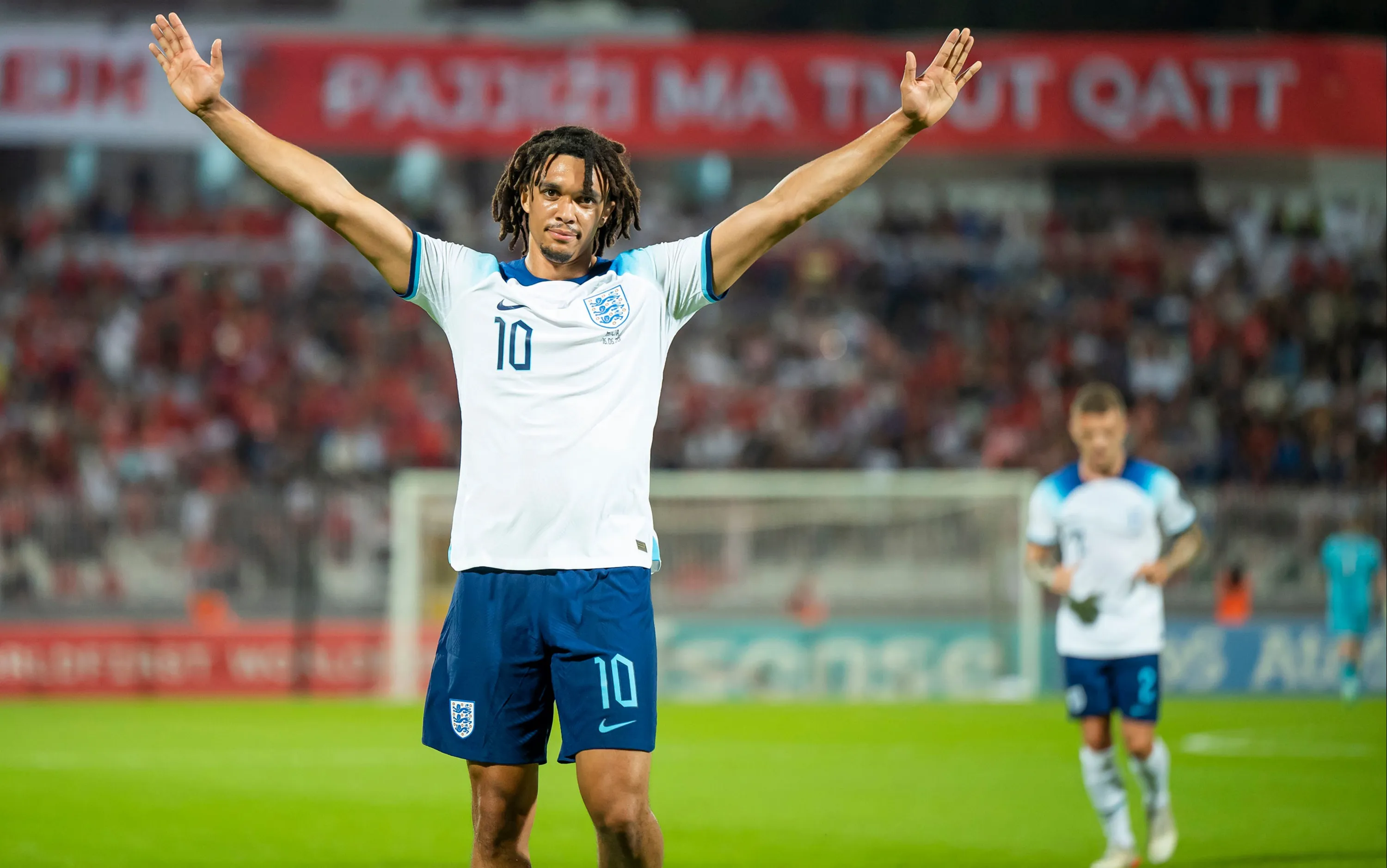 England's Trent Alexander Arnold celebrates after scoring his side's second goal during the Euro 2024 group C qualifying soccer match between Malta and England at the National stadium in Ta' Qali, near Valletta, Malta, Friday, June 16, 2023. (Photo by Rene Rossignaud/AP Photo)