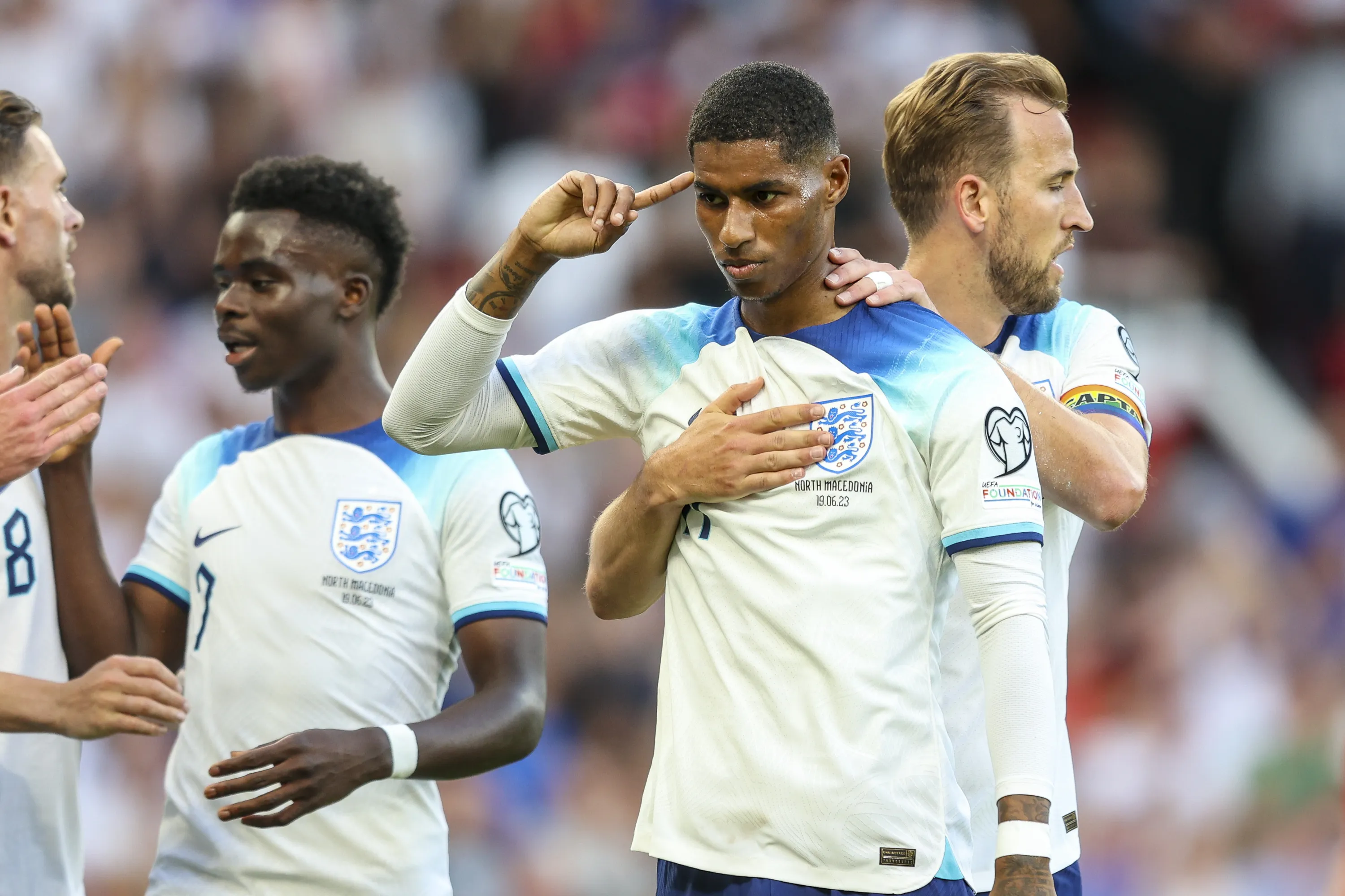 Skipper Harry Kane congratulates team-mate Marcus Rashford of England after he scores a goal to make it 3-0 during the UEFA EURO 2024 qualifying round group C match between England and North Macedonia at Old Trafford on June 19, 2023 in Manchester, England. (Photo by Robin Jones/Getty Images)
