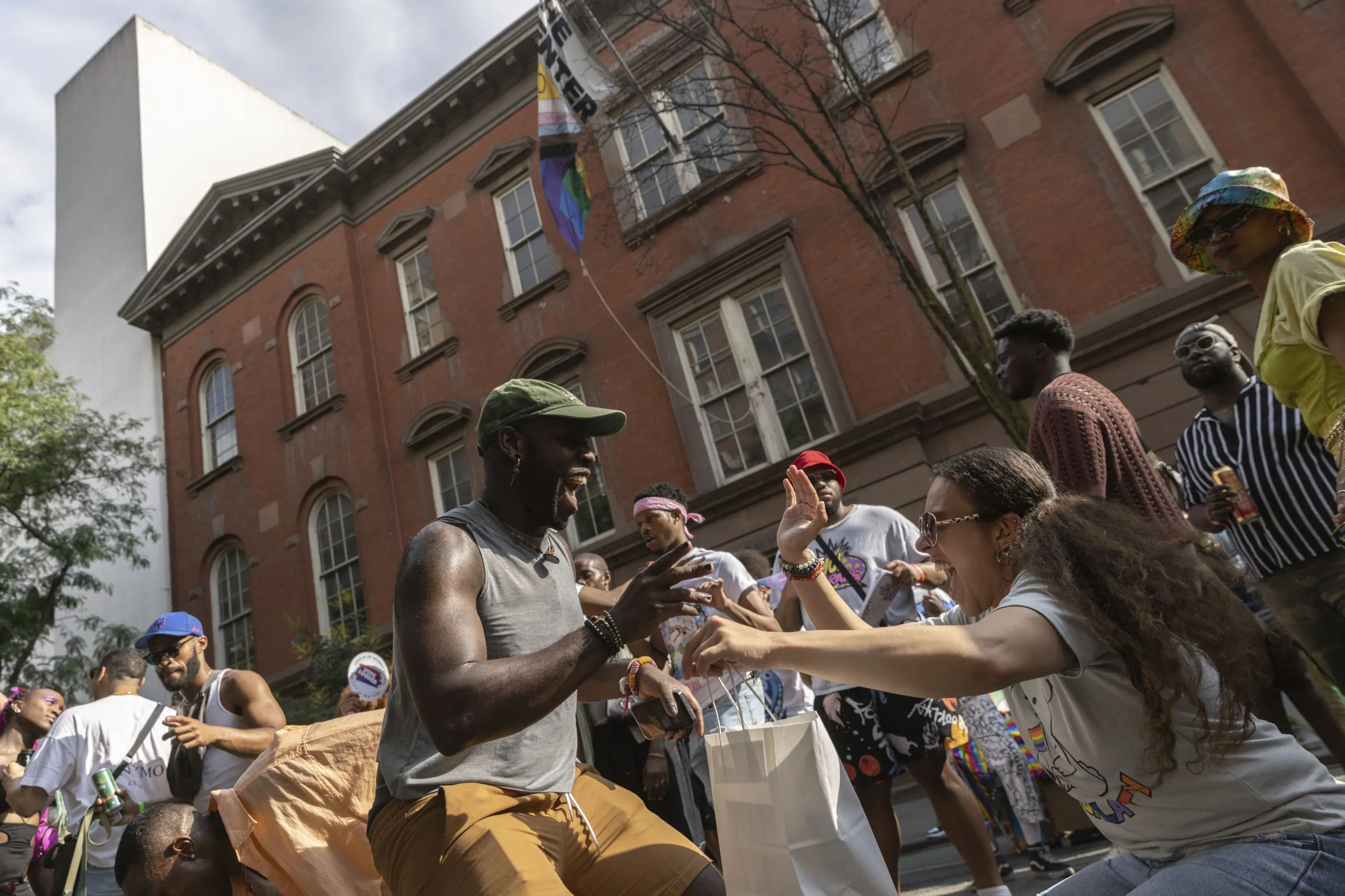 People dance during a Queer Juneteenth Block Party, sponsored by The Center, on Sunday, June 18, 2023, in New York. (Photo by Jeenah Moon/AP Photo)