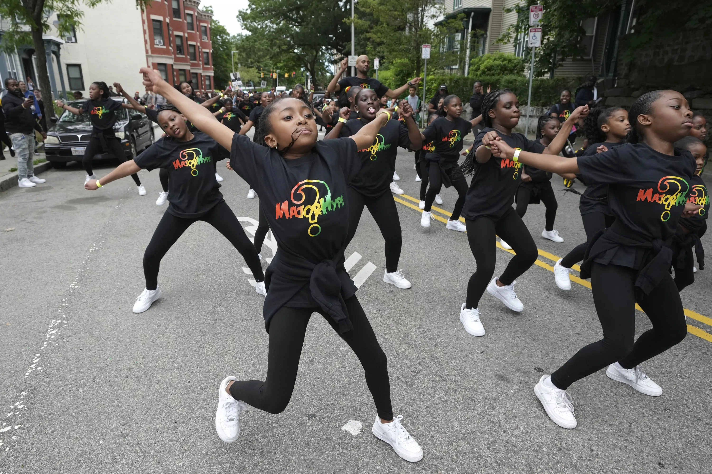 Performers in the MAJORHYPE dance company dance as they make their way along the route of a parade held to commemorate Juneteenth, Monday, June 19, 2023, in Boston. Americans across the country are observing the relatively new Juneteenth federal holiday with festivals, parades, cookouts and other gatherings. (Photo by Steven Senne/AP Photo)