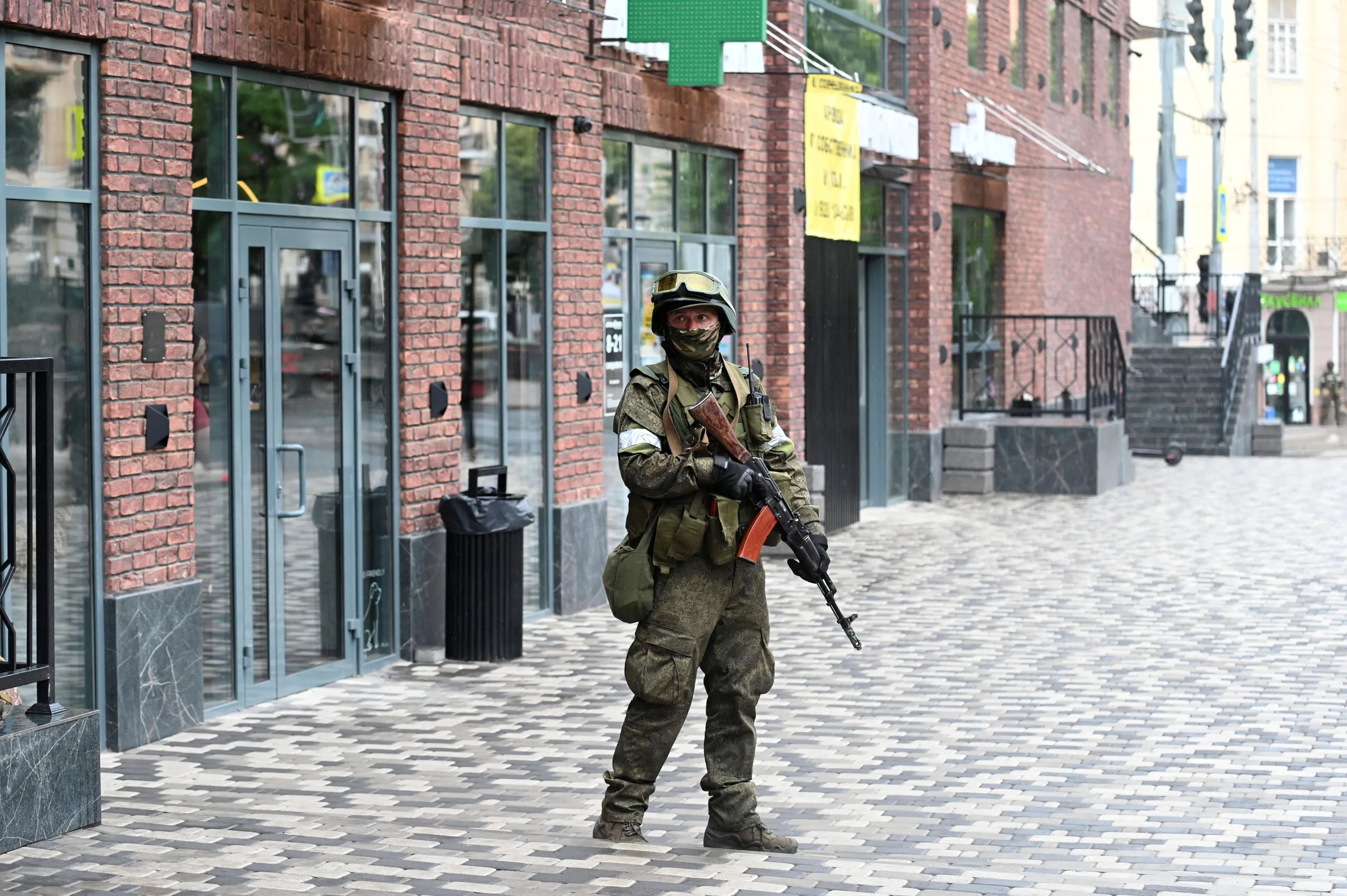 A fighter of Wagner private mercenary group stands guard in a street near the headquarters of the Southern Military District in the city of Rostov-on-Don, Russia on June 24, 2023. (Photo by Reuters/Stringer)
