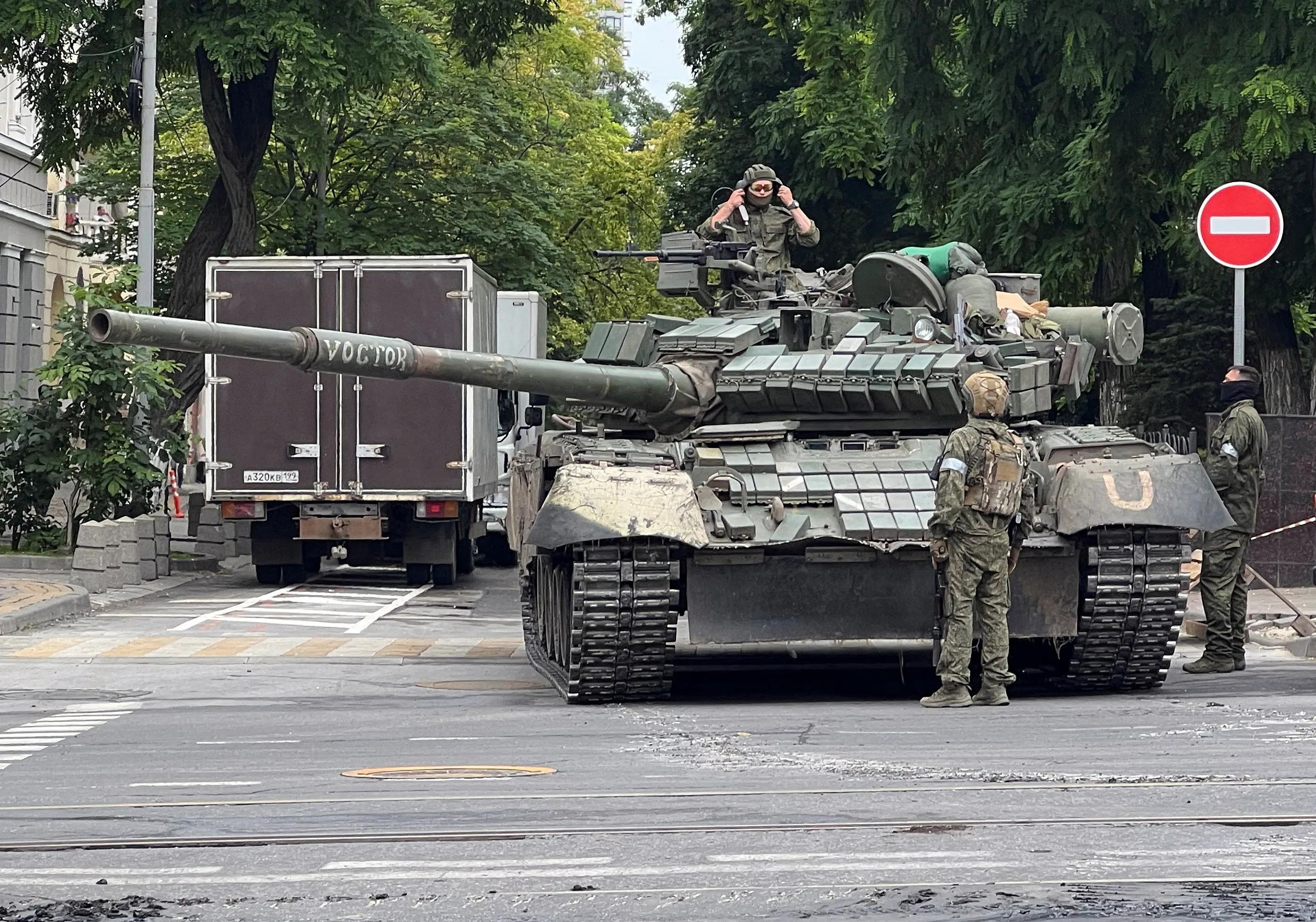 Fighters of Wagner private mercenary group are seen in a street near the headquarters of the Southern Military District in the city of Rostov-on-Don, Russia on June 24, 2023. (Photo by Reuters/Stringer)