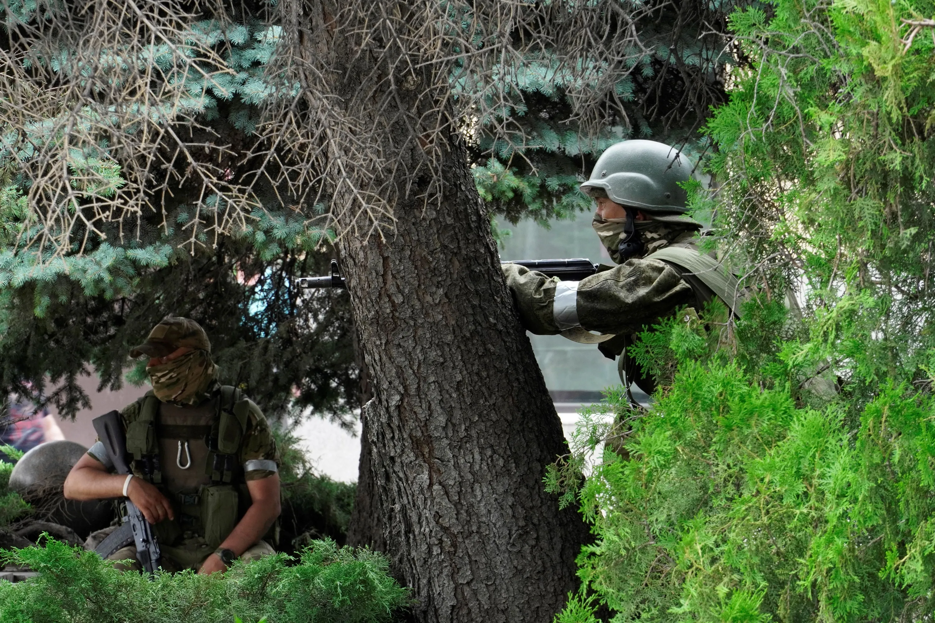Members of Wagner group stand guard in a street in the city of Rostov-on-Don, on June 24, 2023. (Photo by AFP Photo/Stringer)
