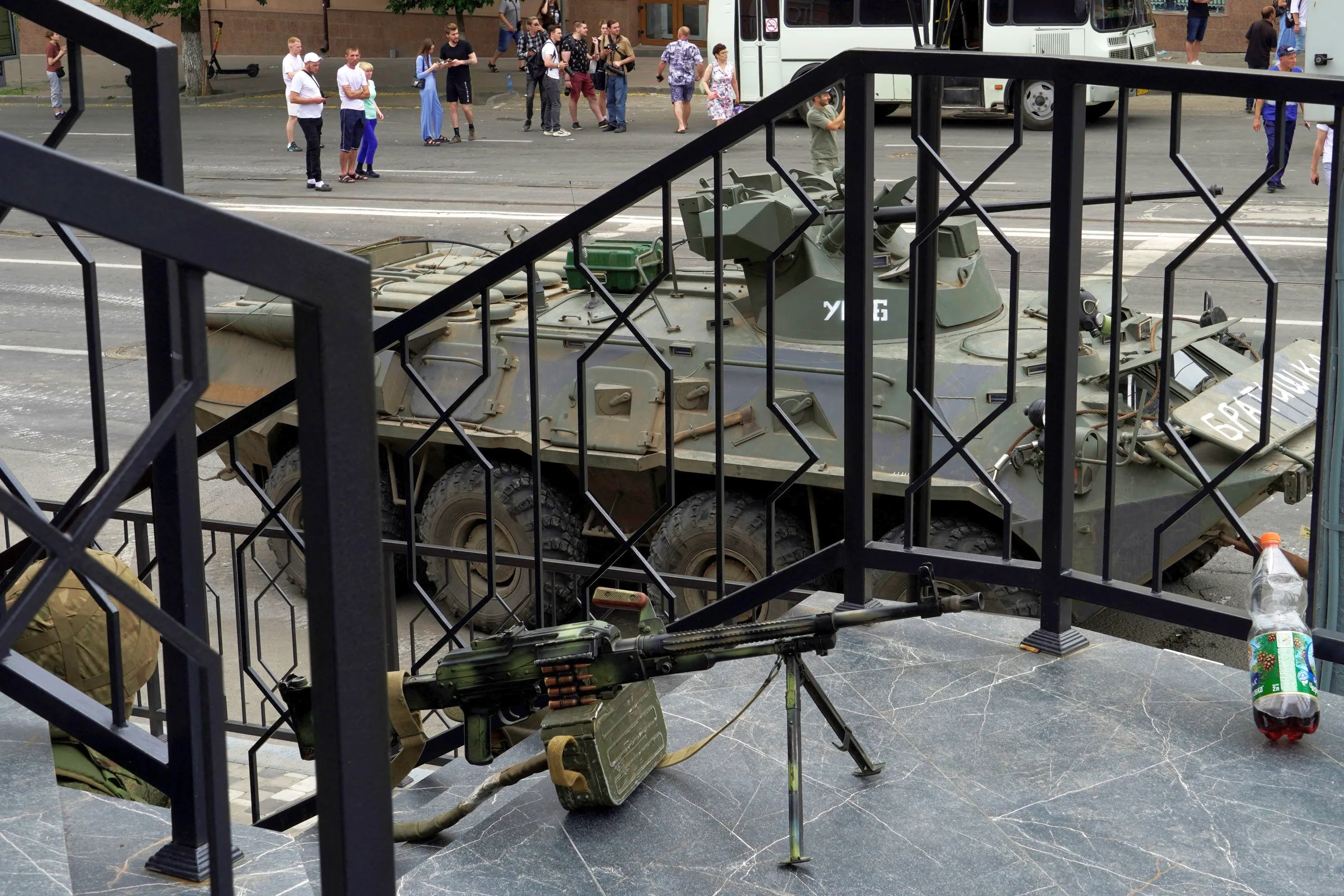 An armoured personnel carrier is parked in a street as a member of Wagner group patrols an area in the centre of Rostov-on-Don – a hub for Russia's Ukraine campaign – where the rebellious Wagner mercenary force said it had taken over key facilities on June 24, 2023. Russia's President Vladimir Putin on June 24, 2023 said an armed mutiny by Wagner mercenaries was a “stab in the back” and that the group's chief Yevgeny Prigozhin had betrayed Russia, as he vowed to punish the dissidents. Prigozhin said his fighters control key military sites in the southern city of Rostov-on-Don. (Photo by AFP Photo/Stringer)