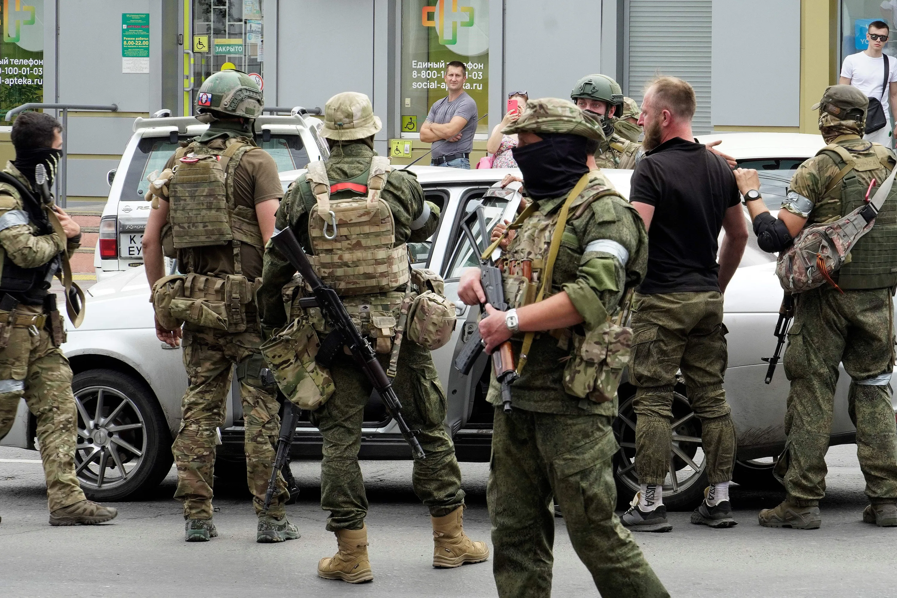 Members of Wagner group inspect a car in a street of Rostov-on-Don, on June 24, 2023. (Photo by AFP Photo/Stringer)