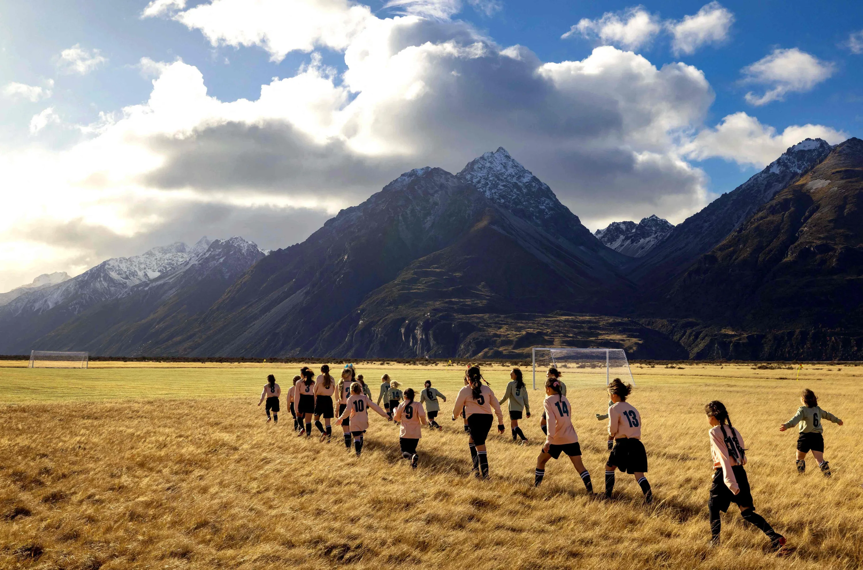 This handout photograph taken by Brett Phibbs on 20 June 2023, and released by Tourism New Zealand shows Tourism New Zealand celebrating one month to go until the FIFA Womenís World Cup 2023ô by installing a full size football pitch at Aoraki Mount Cook. The pitch hosted an exhibition match between local girls as well as a training session with Football Ferns Katie Bowen and Emma Rolston, dubbed the Beautiful Game, played in one of the most beautiful places on earth – New Zealand. (Photo by Brett Phibbs/Tourism New Zealand via AFP Photo)