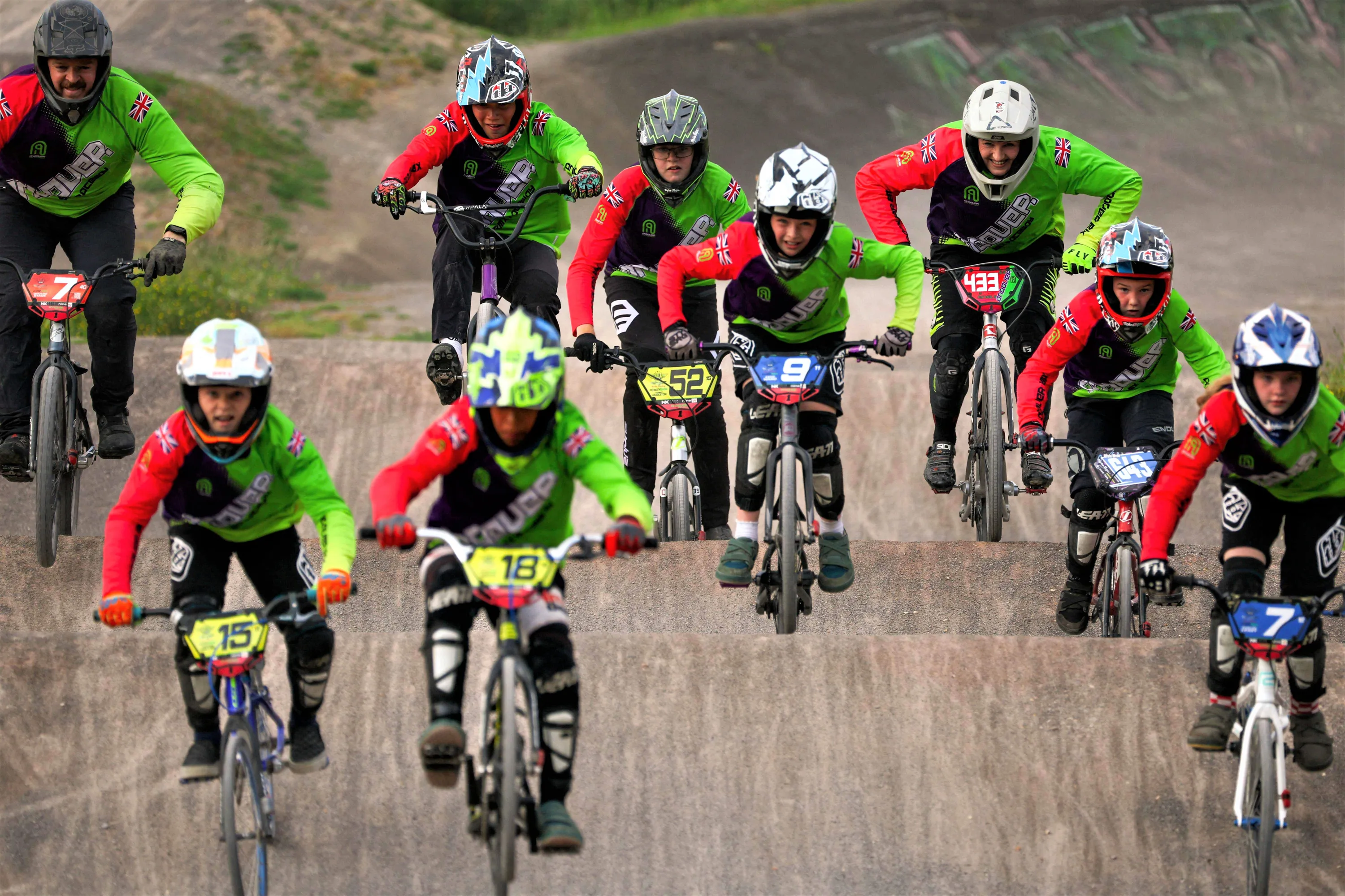 British BMX rider Sarah-Jane Nichols (3R) goes over a jump alongside young riders during a training session at Andover BMX club in southern England on June 14, 2023. Known as the “Godmother of BMX”, Nichols is making a comeback in the sport at the age of 53. Nichols, who retired in 1988, was seven times British champion, four times European, and the 1986 World Champion. She was inducted into the British BMX Hall of Fame as the first female racer at a ceremony in Birmingham last year. (Photo by Adrian Dennis/AFP Photo)