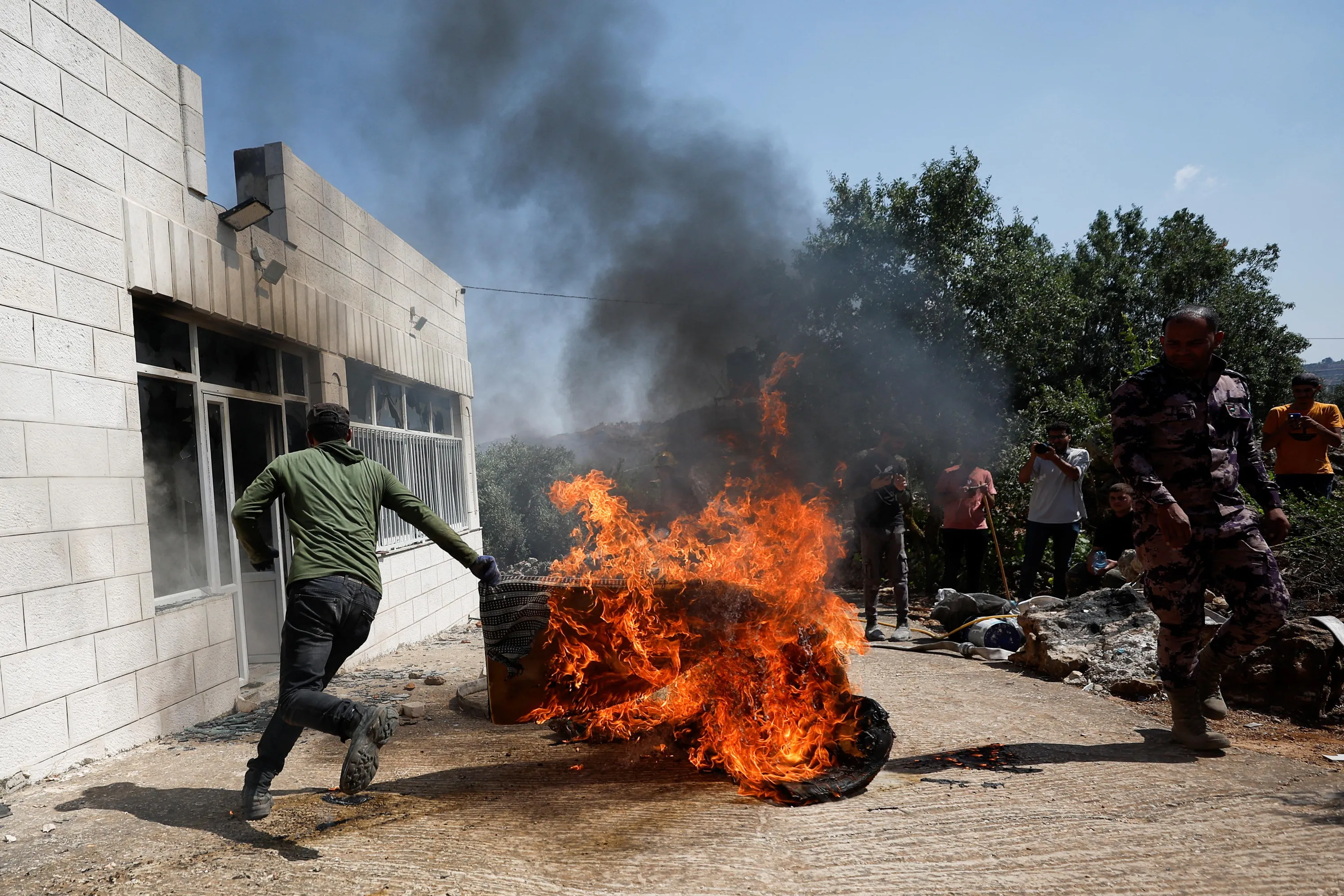 A Palestinian man runs near a burning object, after an attack by Israeli settlers, near Ramallah, in the Israeli-occupied West Bank on June 21, 2023. (Photo by Mohamad Torokman/Reuters)