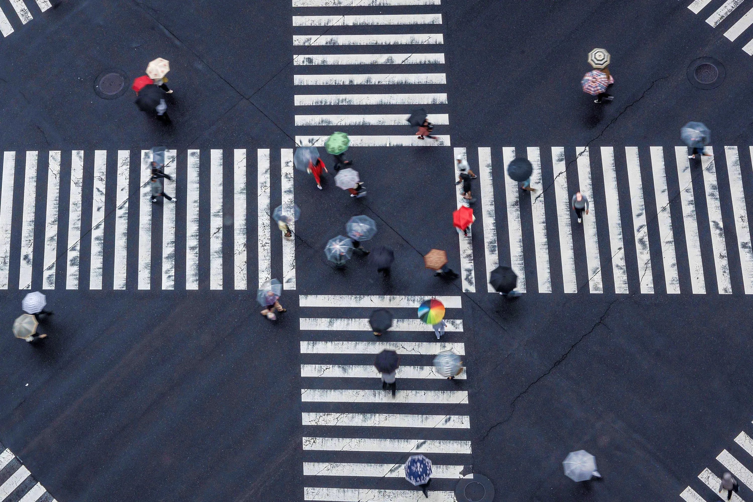 Pedestrians cross an intersection in the rain in the Ginza district of Tokyo on May 23, 2023. (Photo by Richard A. Brooks/AFP Photo)