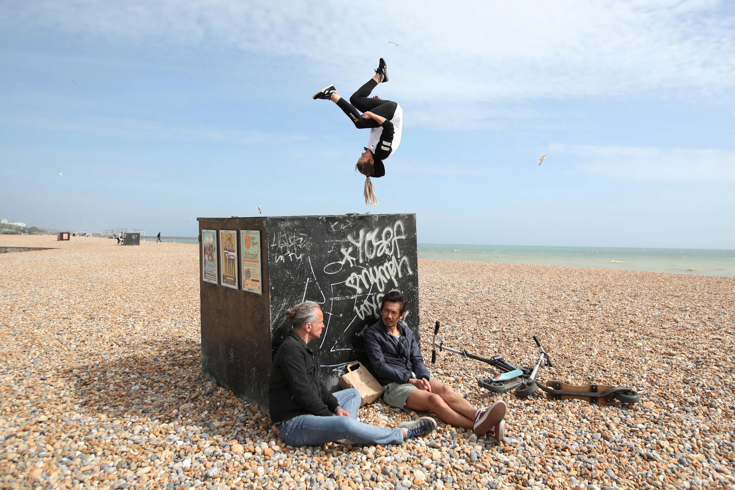 Parkour athlete Lynn Jung trains in Brighton while people are seen relaxing on the beach, following the outbreak of the coronavirus disease (COVID-19), Brighton, Britain on May 22, 2020. (Photo by Peter Cziborra/Reuters)