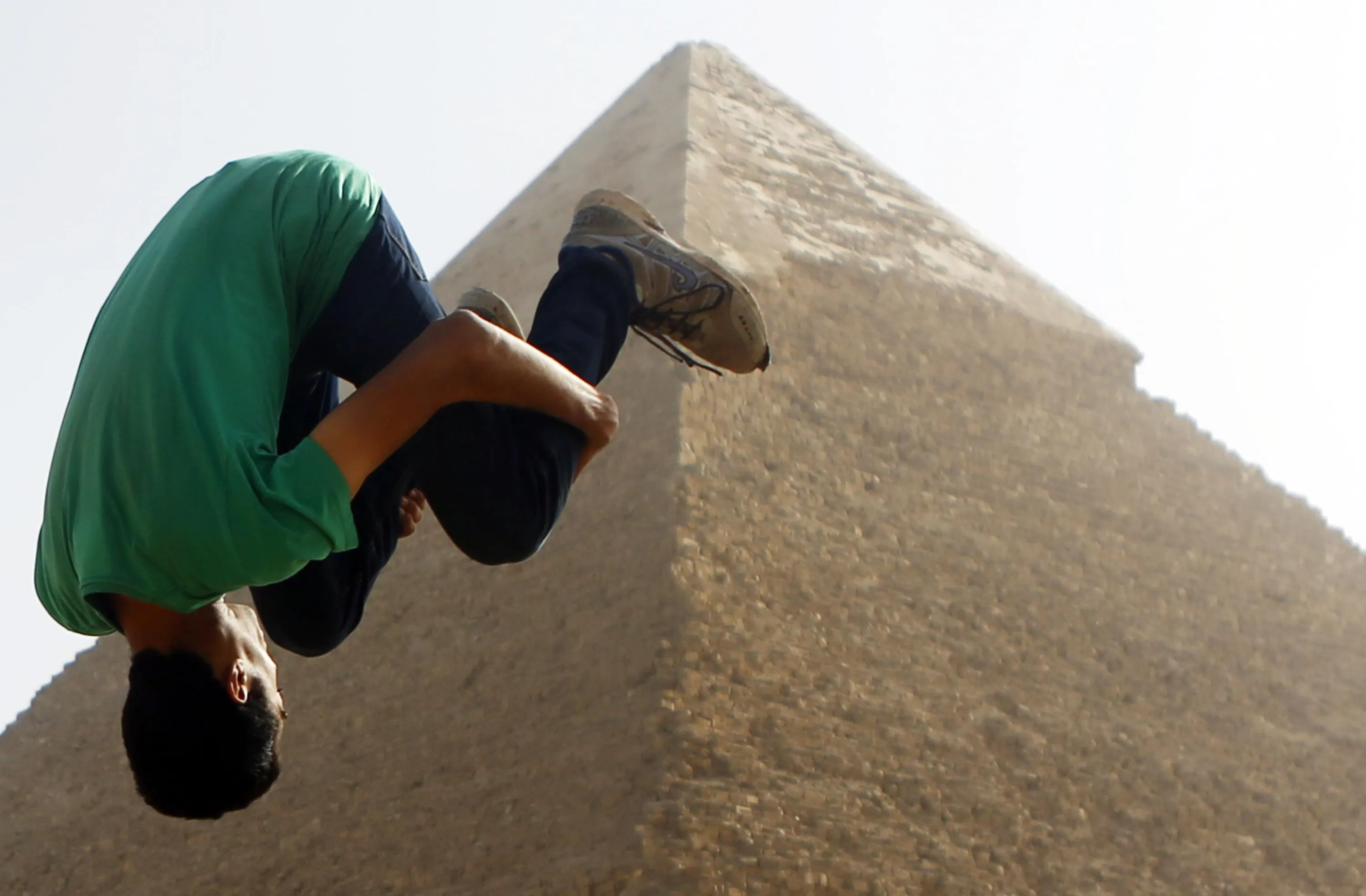 Faisel,16, a member of Egyptian parkour group “EGY PK”, practices a jump in front of the Pyramid of Khufu, the largest of the Great Pyramids of Giza, on the outskirts of Cairo on December 9, 2014. (Photo by Amr Abdallah Dalsh/Reuters)