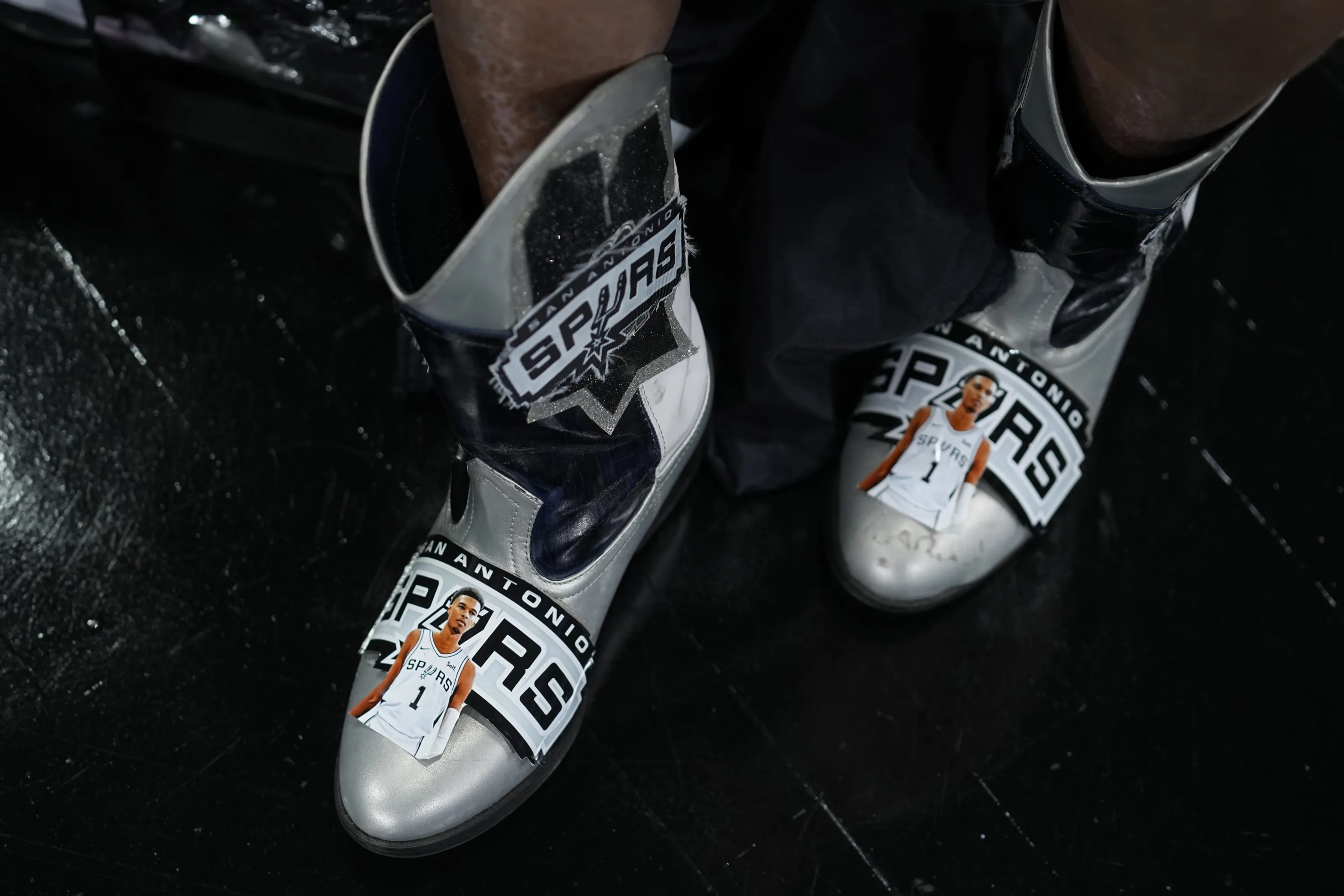 Images of Victor Wembanyama are seen on the cowboy boots of fan Sovia Lauriano as she arrives to watch the NBA basketball draft at the AT&T Center in San Antonio, Thursday, June 22, 2023. San Antonio had. (Photo by Eric Gay/AP Photo)