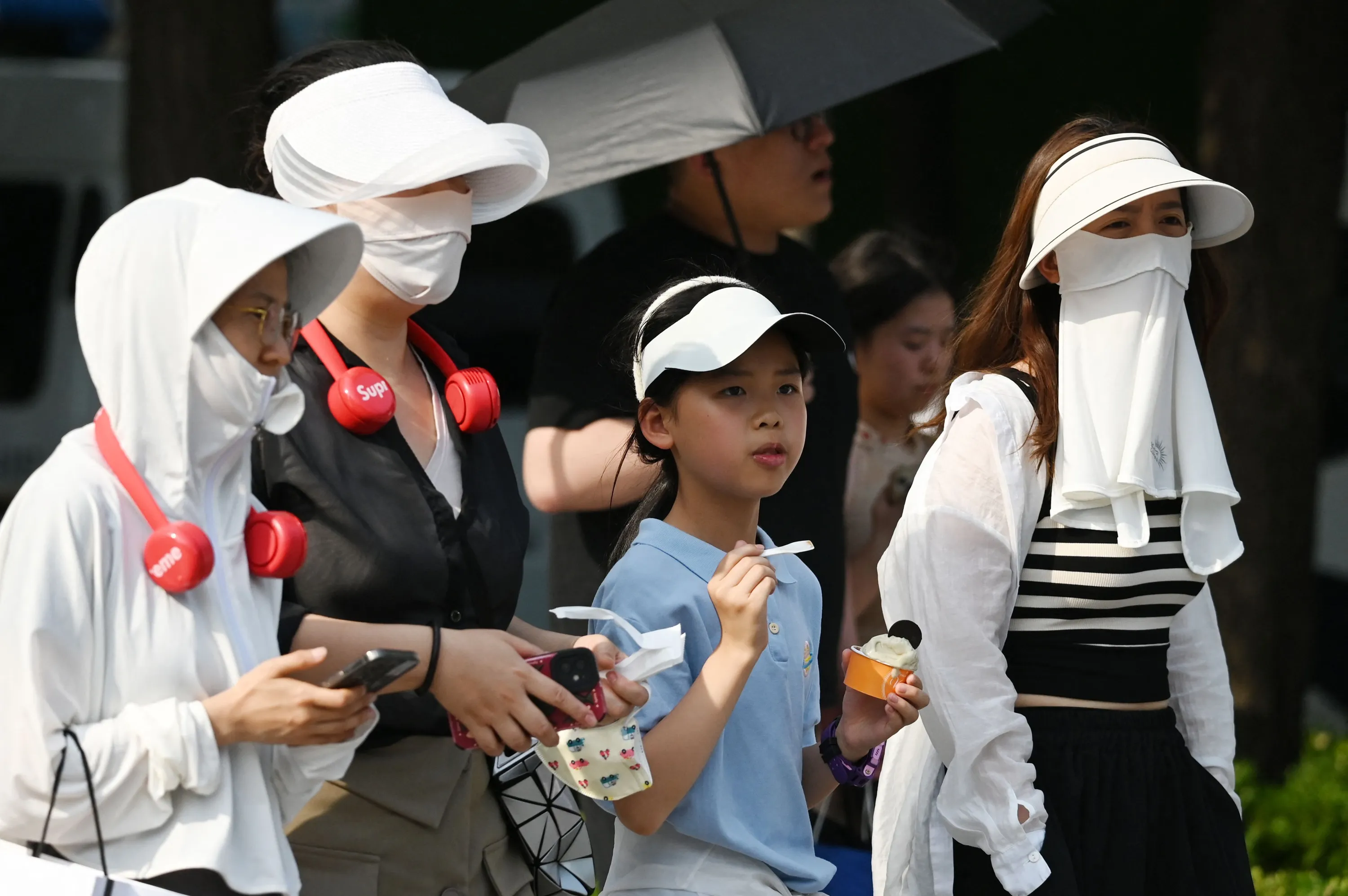 People wear head coverings during a heatwave in Beijing on June 23, 2023. (Photo by Greg Baker/AFP Photo)