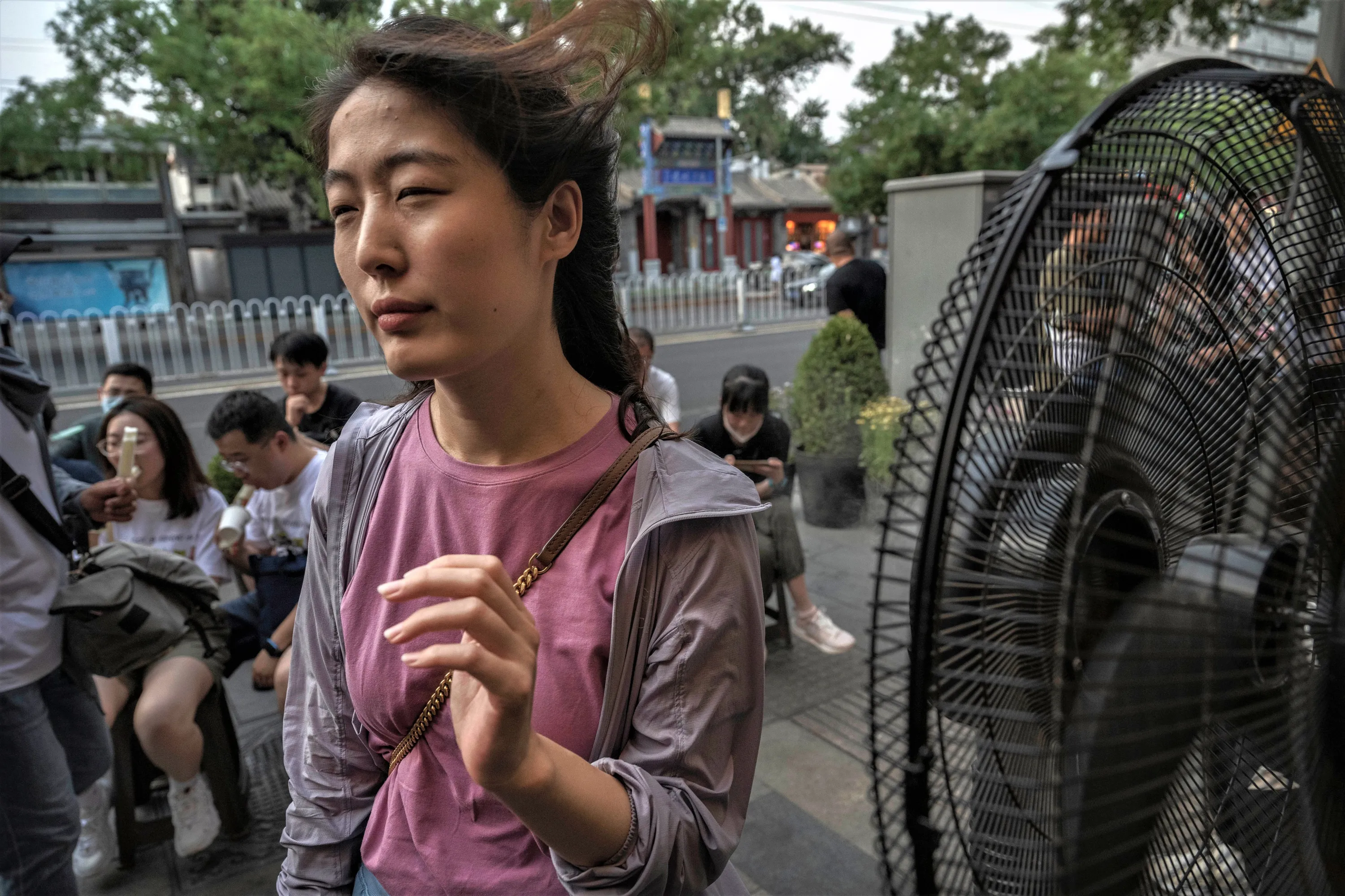 A woman cools herself on a misting fan as she waits for a table outside a popular local restaurant during a heatwave on June 23, 2023 in Beijing, China. Authorities issued a red alert for high temperatures, the highest in the country's four tier system, as China's capital and other parts of northern China saw scorching temperatures hovering around 40 degrees Celsius. (Photo by Kevin Frayer/Getty Images)