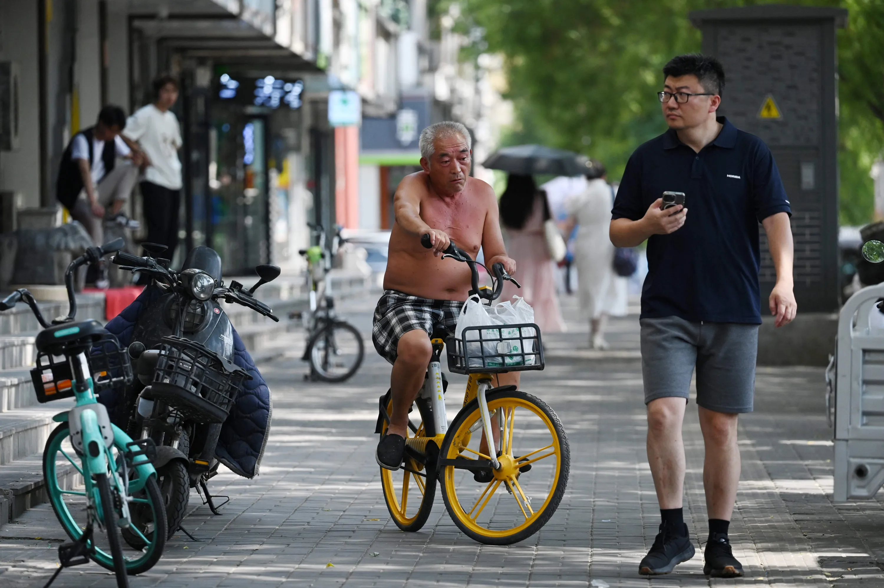 A shirtless man rides a bike during a heatwave in Beijing on June 23, 2023. (Photo by Greg Baker/AFP Photo)