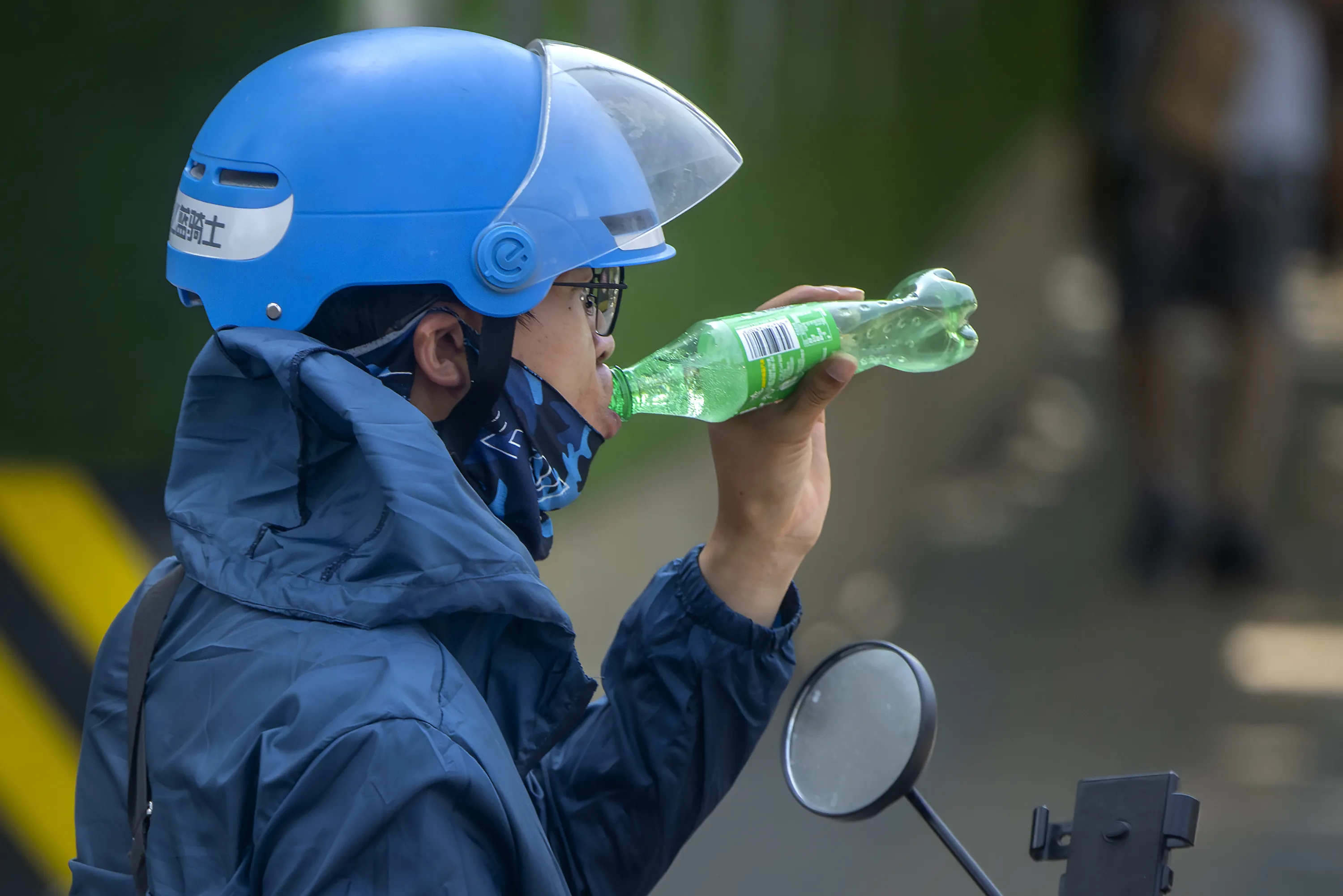 A delivery driver takes a drink as he waits at a traffic light on an unseasonably hot day in Beijing, Saturday, June 24, 2023. (Photo by Mark Schiefelbein/AP Photo)