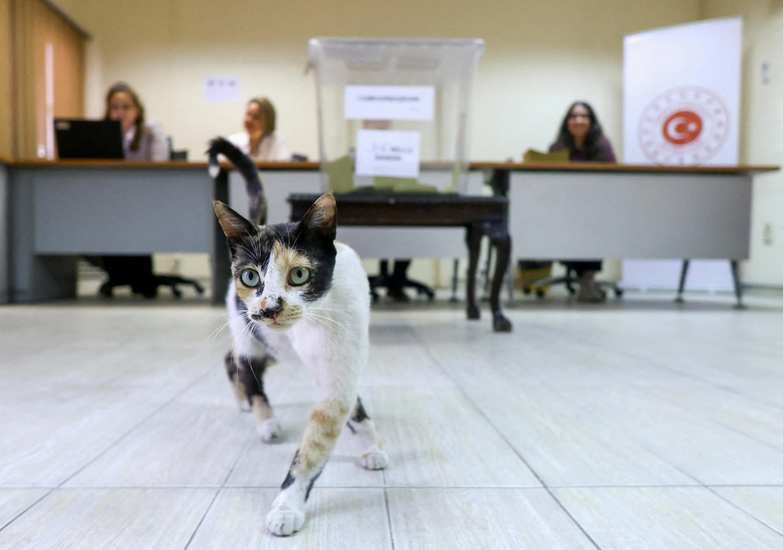 A stray cat walks in front of a ballot box at a polling station for Turkish citizens living abroad, as part of the second round of the Turkish presidential election, at the Turkish Embassy in Cairo, Egypt on May 22, 2023. (Photo by Amr Abdallah Dalsh/Reuters)