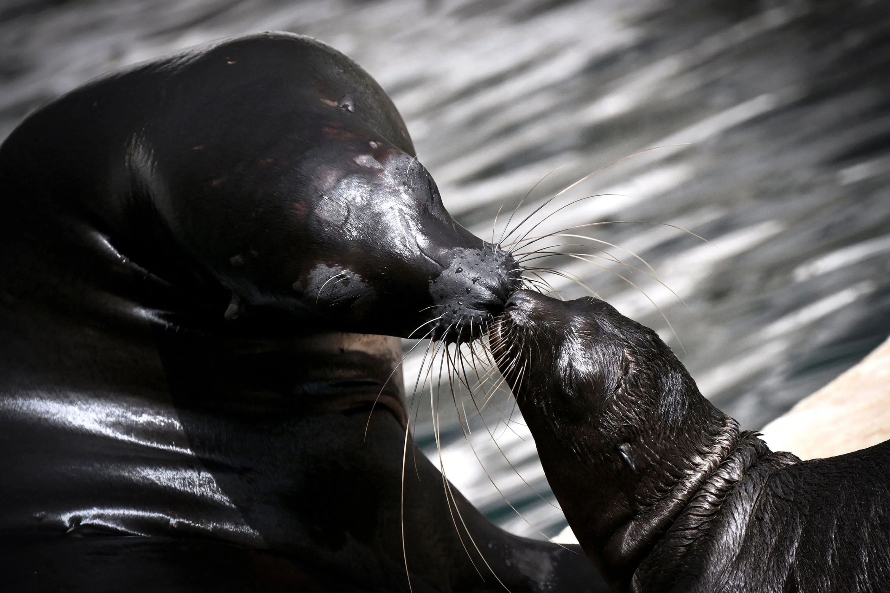 California sea lion mother Samantha pets her pup, born on June 7, at Bioparco in Rome on June 22, 2023. A California sea lion was born on June 7, 2023 for the first time at the Bioparco of Rome, from Samantha and Boomer, coming respectively from Stuttgart zoo and French Zooparc de Beauval. (Photo by Tiziana Fabi/AFP Photo)